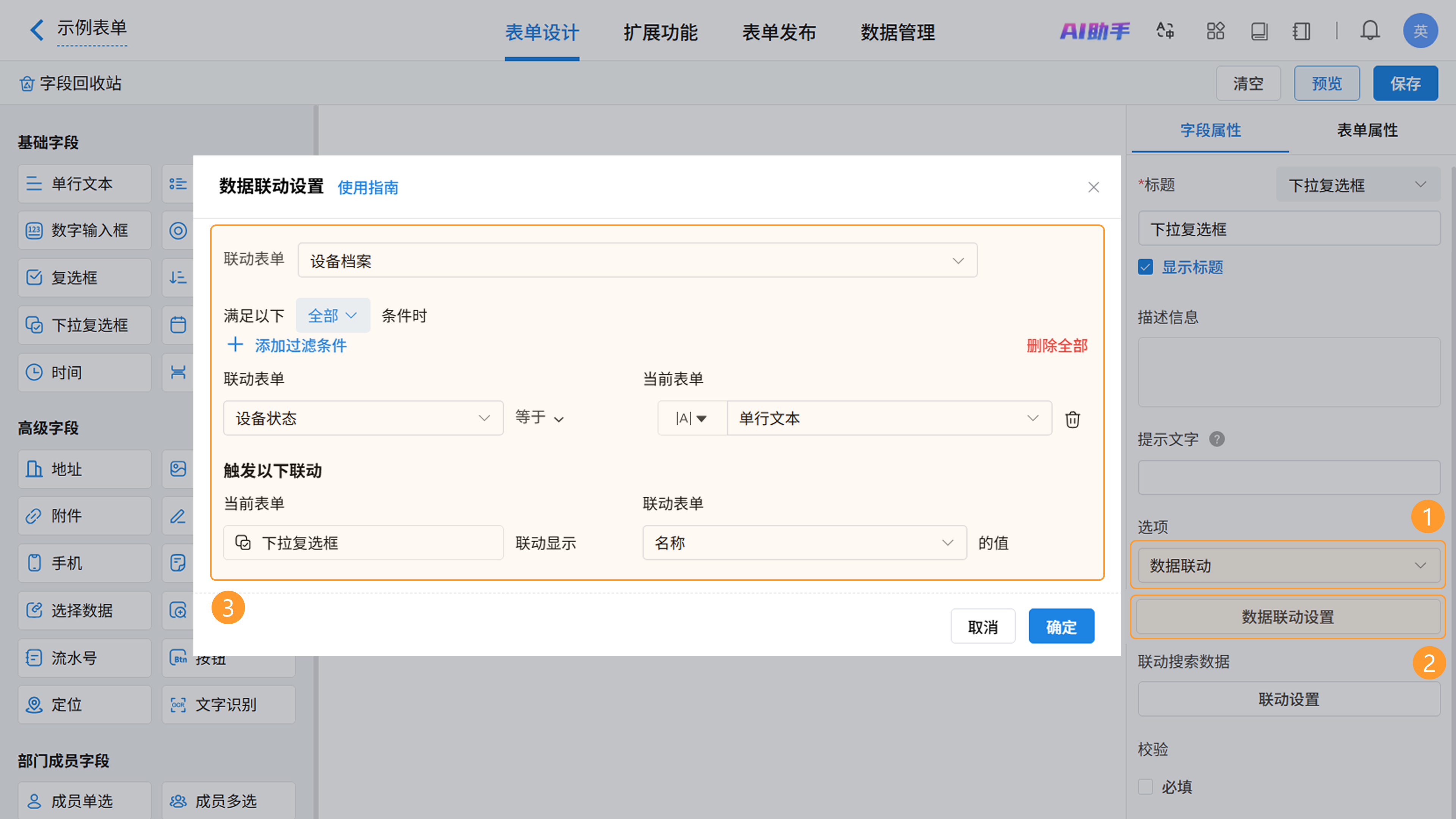 数据联动是指,根据当前表单中其他字段的值,动态筛选其他表单中满足特定条件的数据作为下拉选项。
