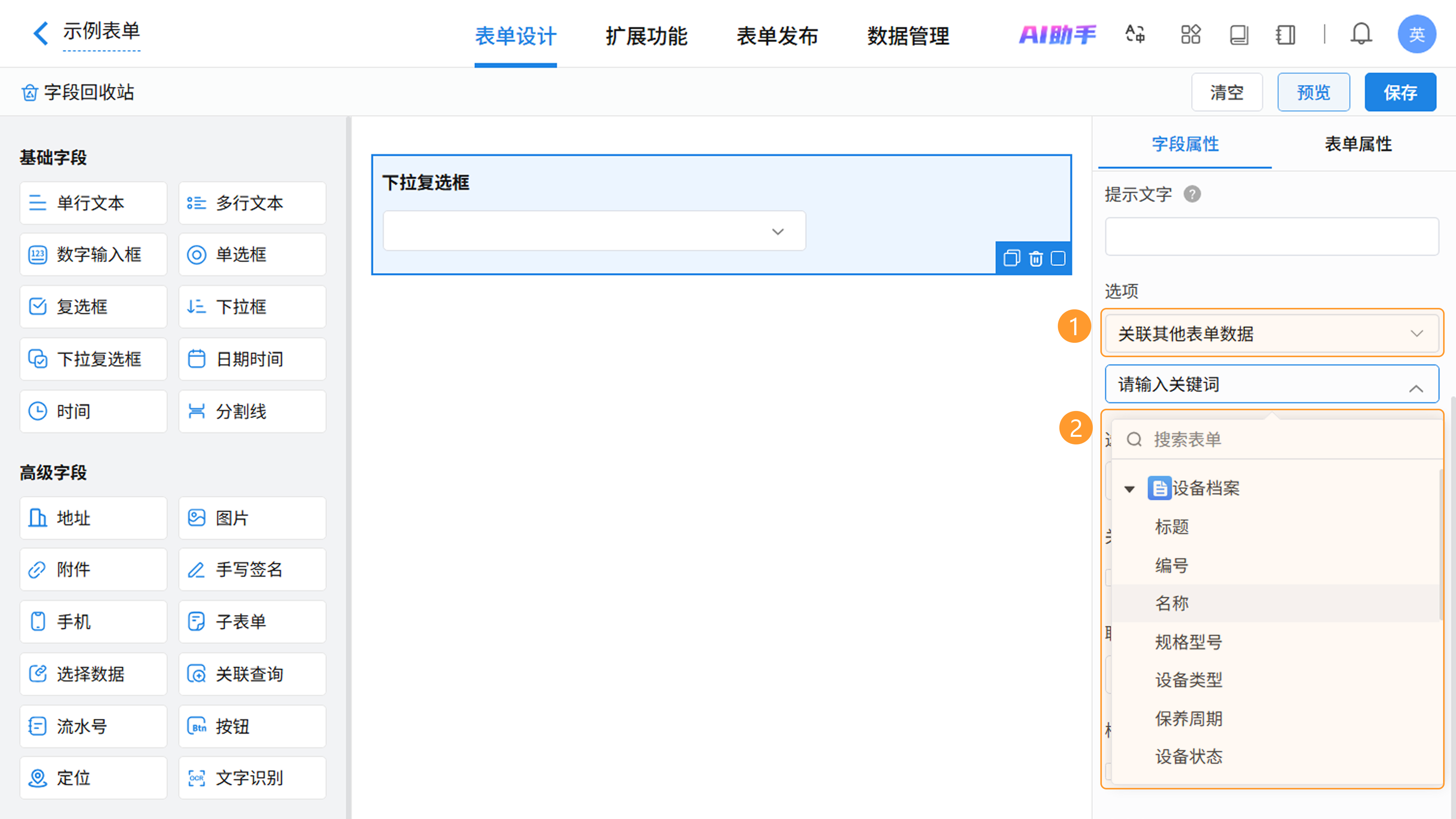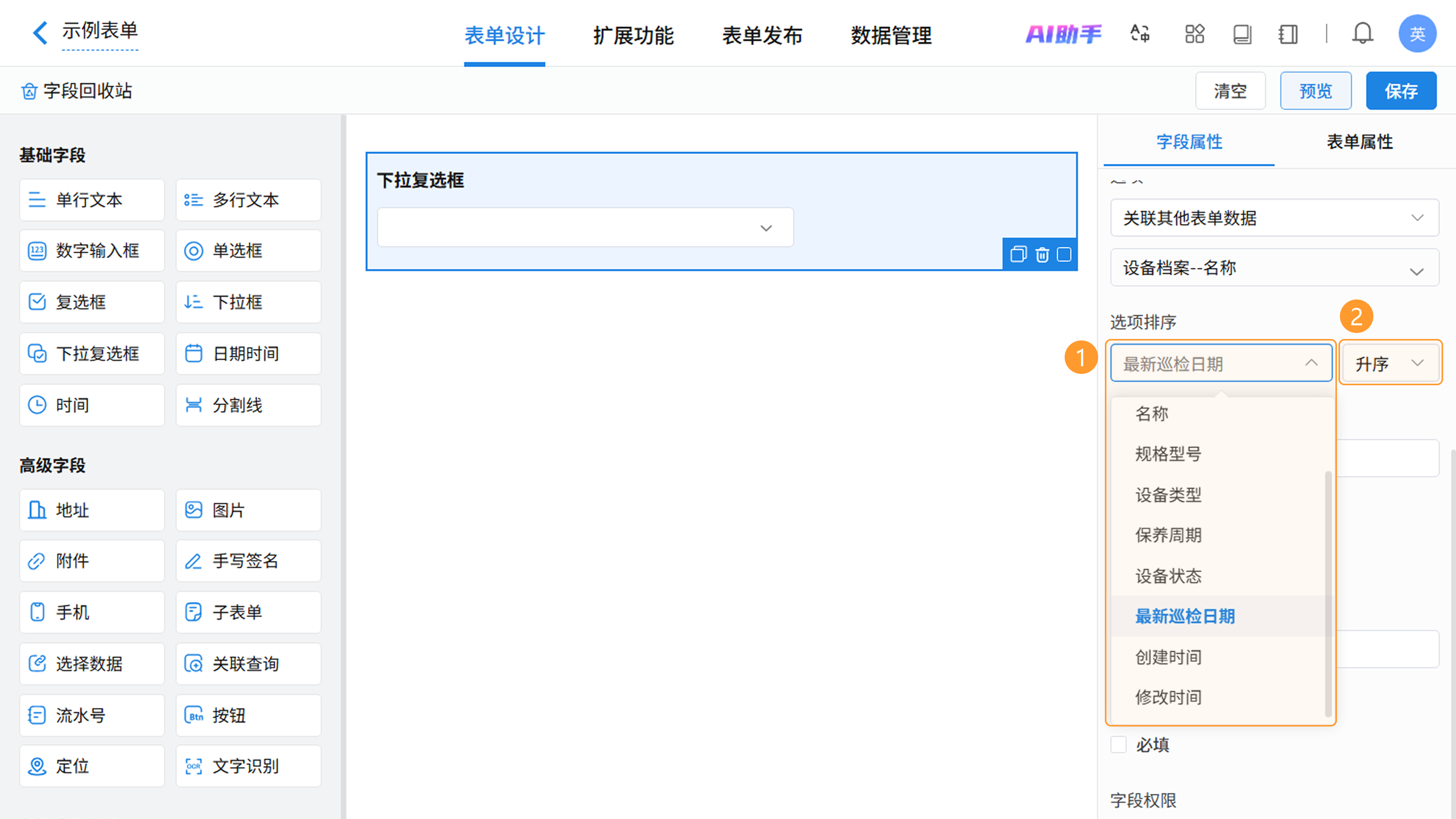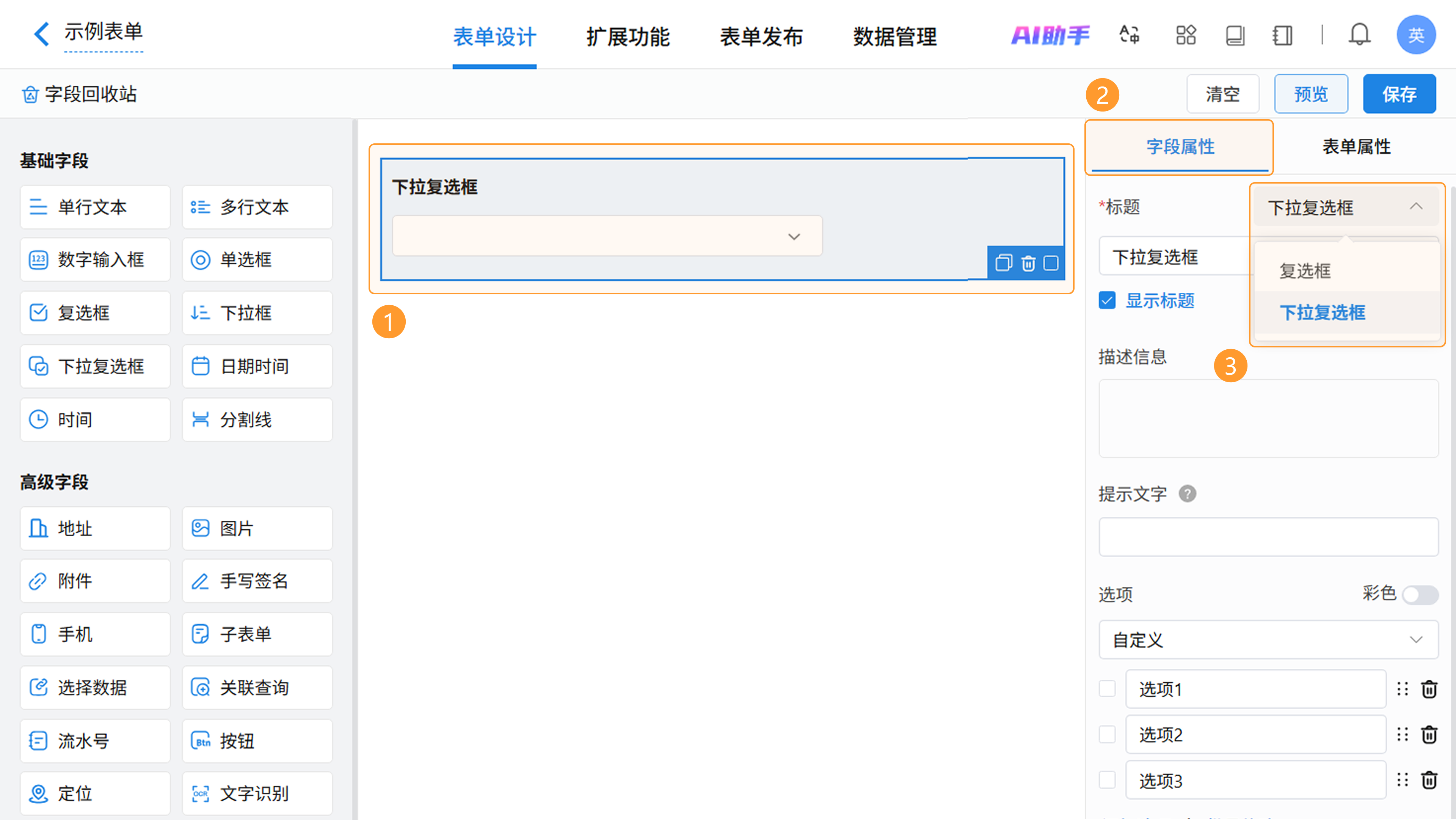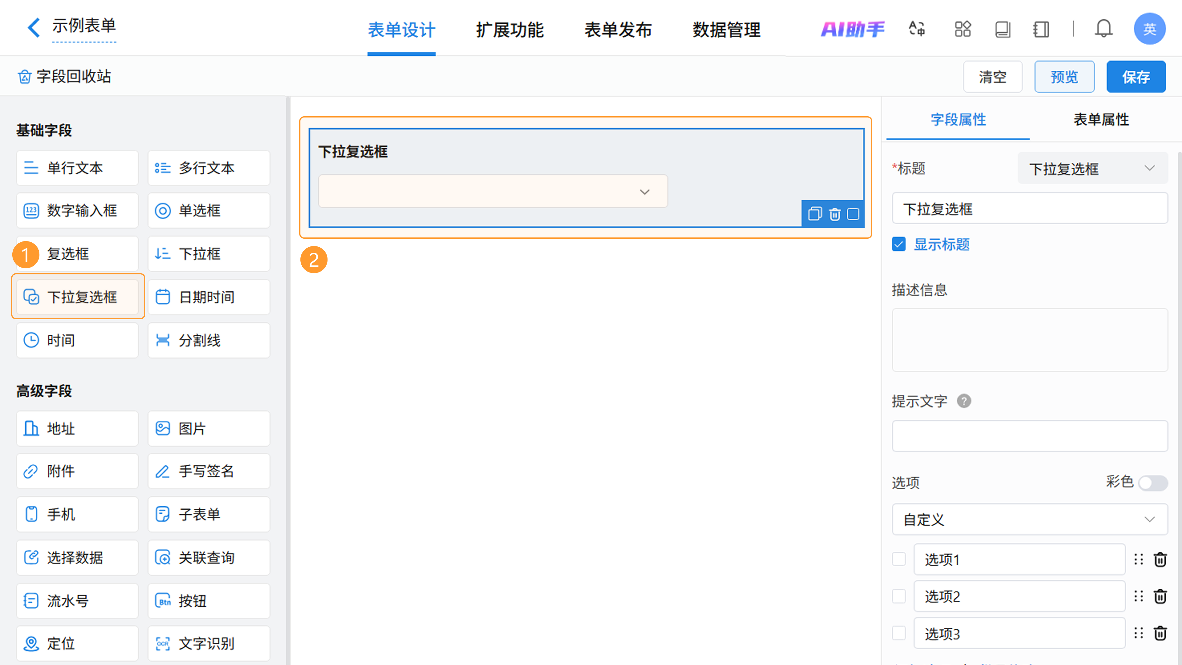 在表单设计页面,从左侧字段区拖拽或点击即可添加下拉复选框字段,在右侧属性区进行个性化配置。