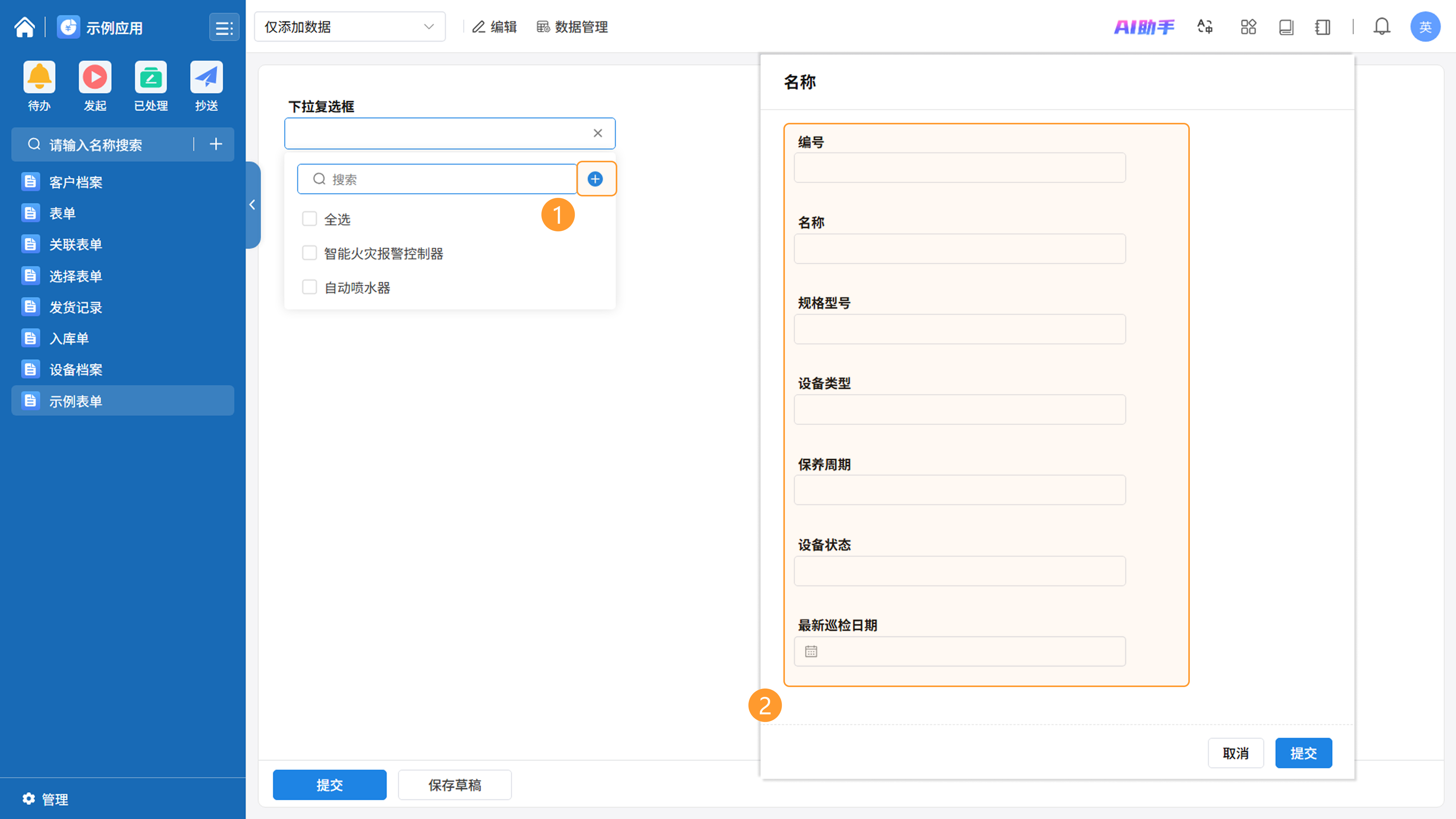 4)允许新增关联表数据:勾选此项后,填表人在录入数据时,若发现选项不满足需求,可点击「添加」图标直接打开关联表的新增数据弹窗。