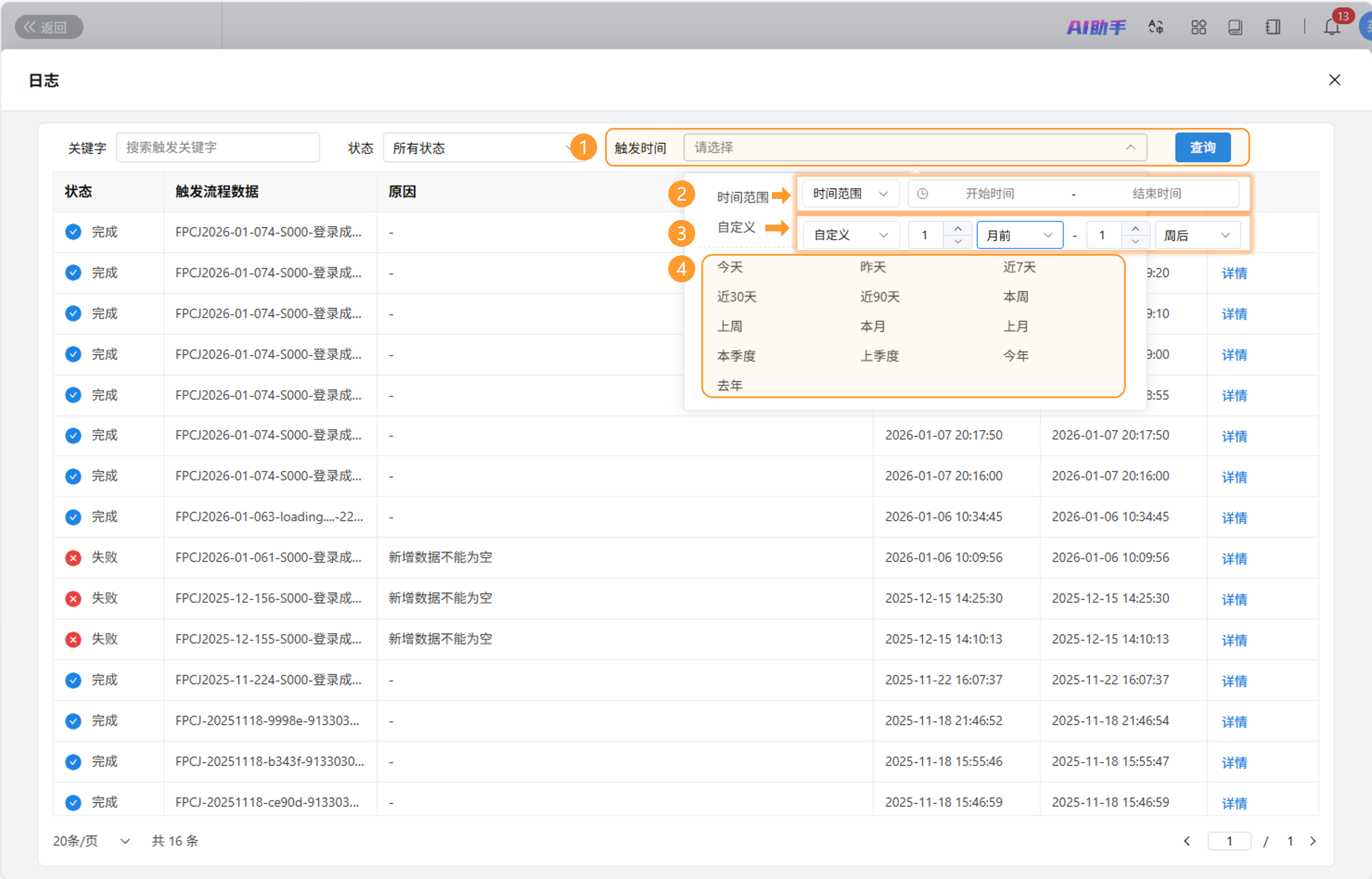 - 自定义:根据时间轴以年/季/月等为时间单位筛选一[年/季/月...]前到一[年/季/月...]后的流程日志。