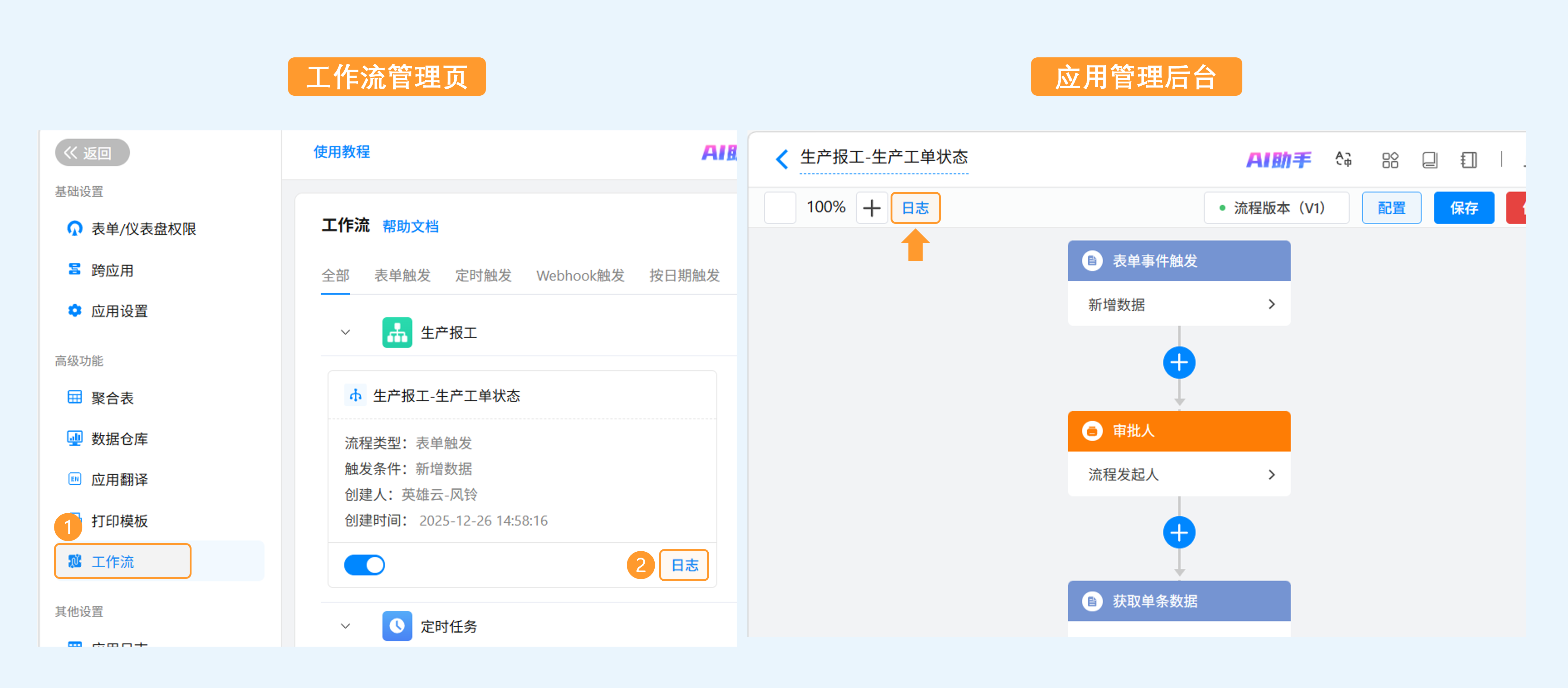 - 流程卡片底部:在「工作流管理」页面,点击流程卡片底部的「日志」按钮进入流程日志列表页。