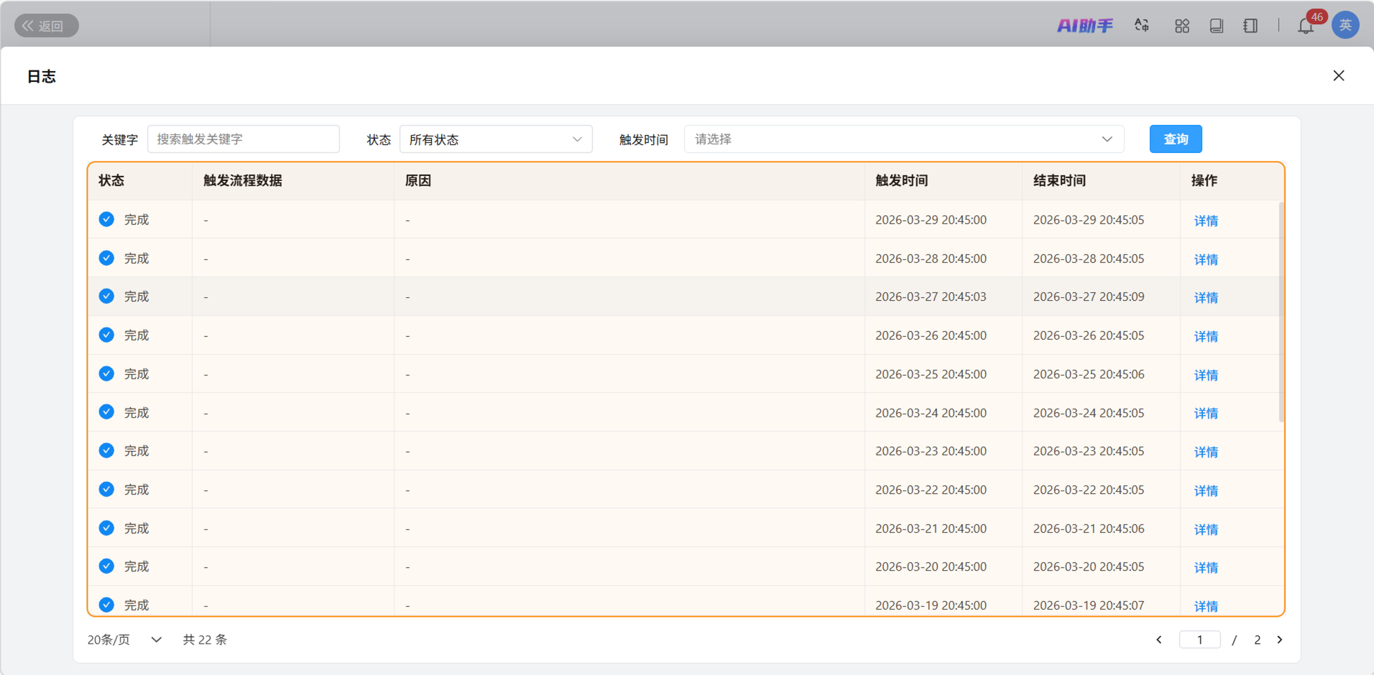 | 操作 | 提供对单条日志的交互按钮: • 终止:仅对“等待”状态生效,点击后弹出确认框,强制停止流程。 • 详情:点击打开「日志详情」窗口。 |