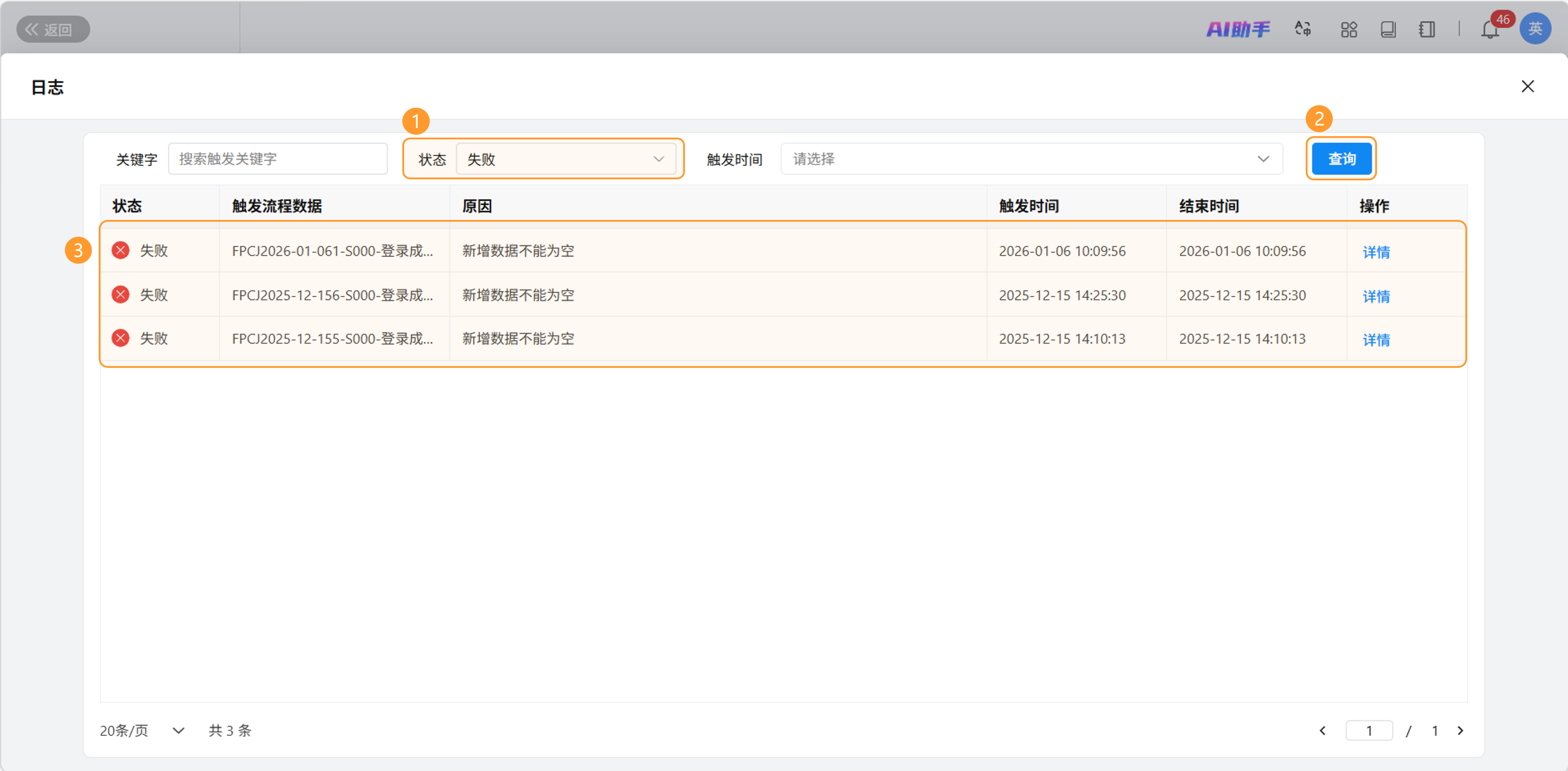 | 原因 | 仅在状态为“失败”时显示。简要描述工作流运行失败的主要原因(如:数据为空、权限不足、数据格式错误等)。 |