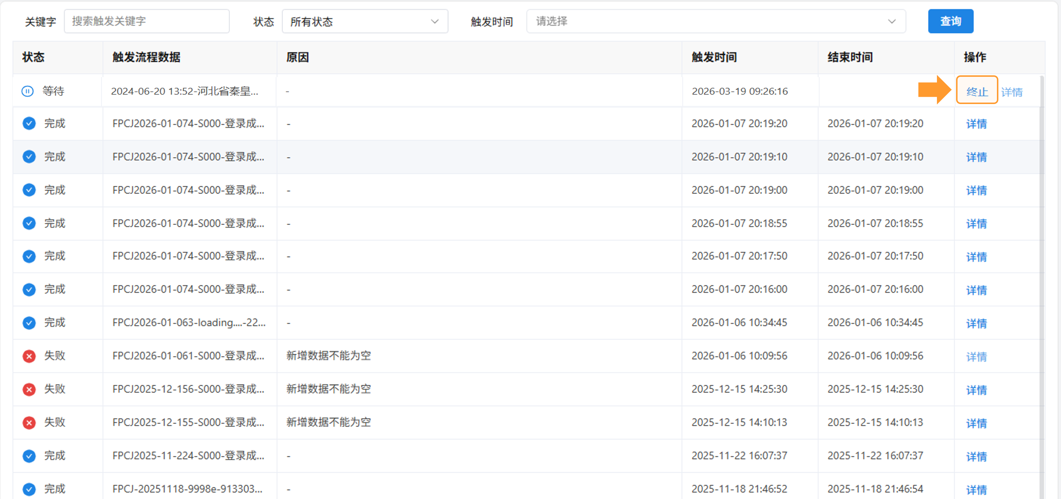 - 终止:筛选被手动停止或超时强制停止的流程。