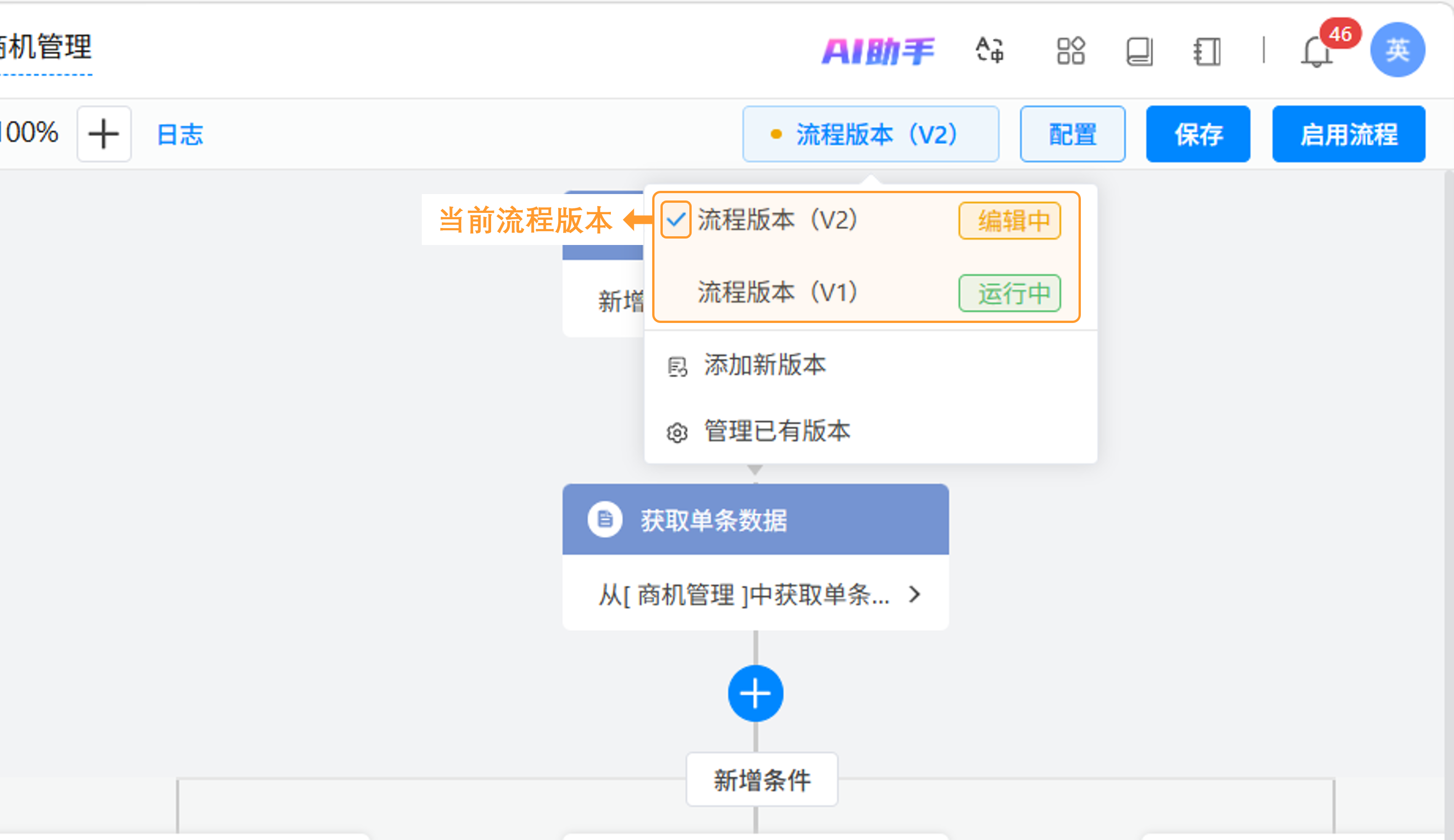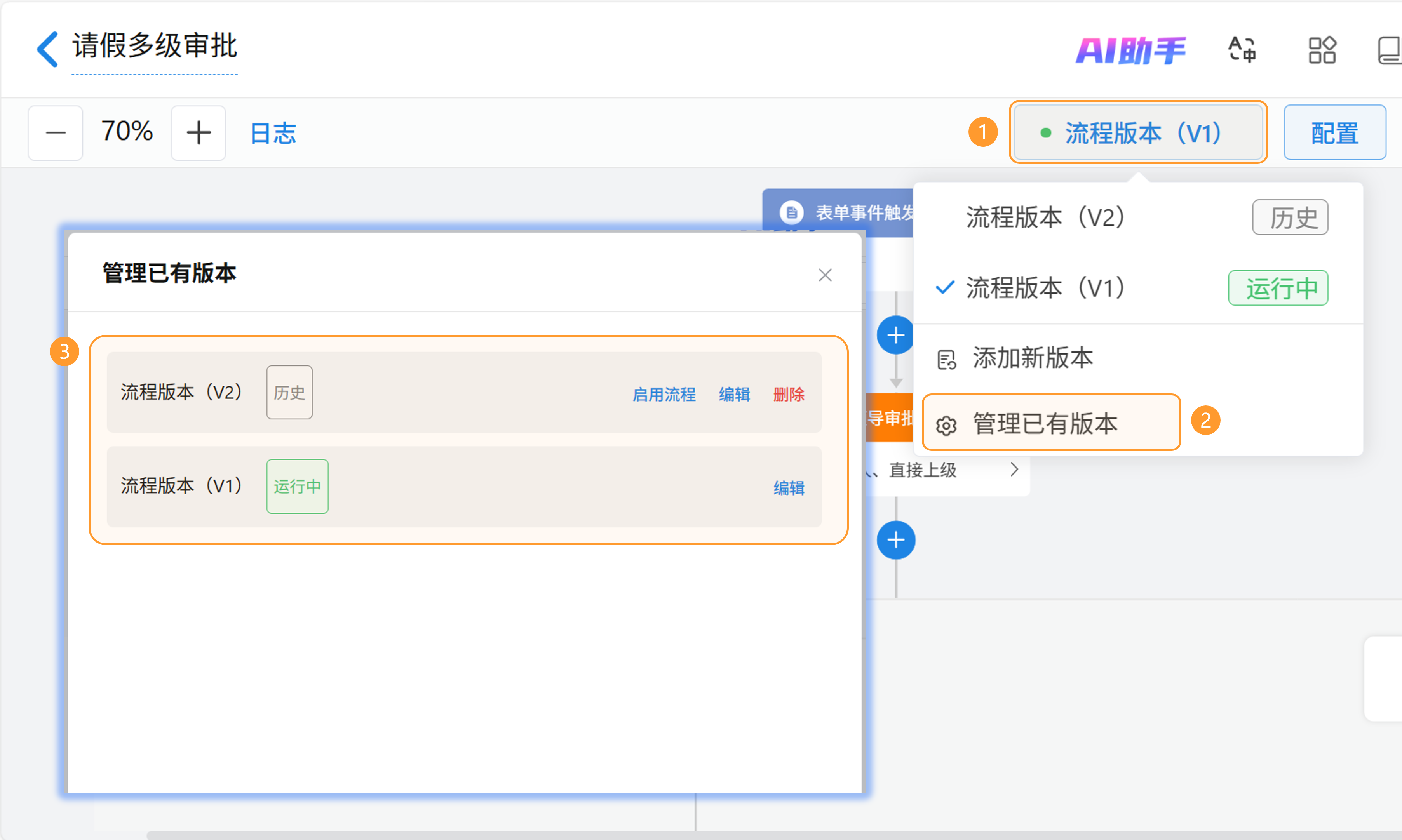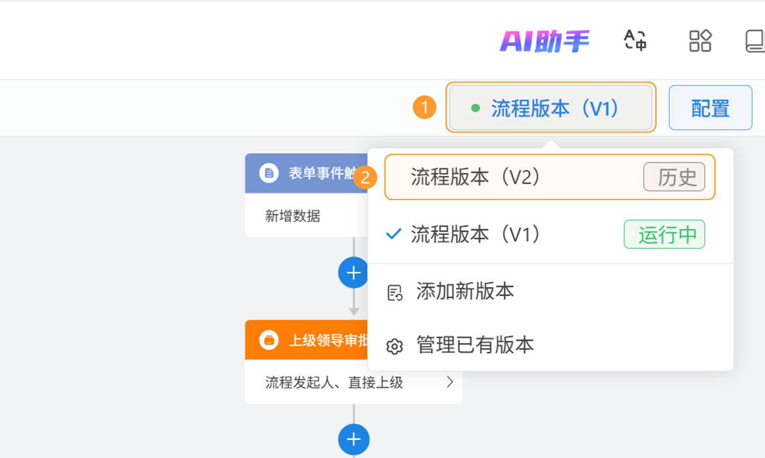 1)操作入口:进入流程设计页面,点击右上角「流程版本」按钮,选择「管理已有版本」;