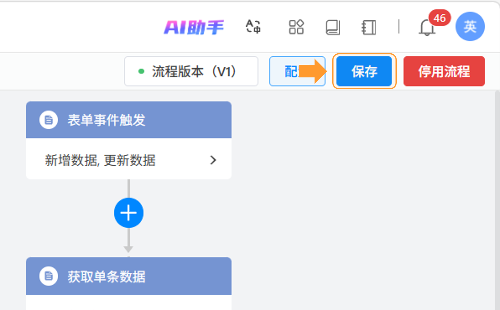 2)操作入口:进入流程设计页面,点击右上角「保存」按钮保存当前流程设计,点击「流程版本」按钮。
