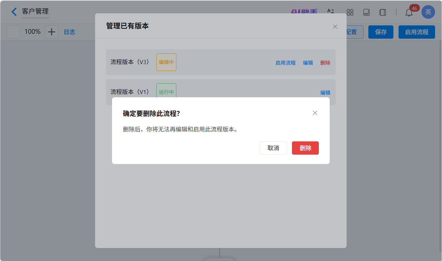 - 注意:版本删除后数据无法恢复,请谨慎执行流程删除操作。