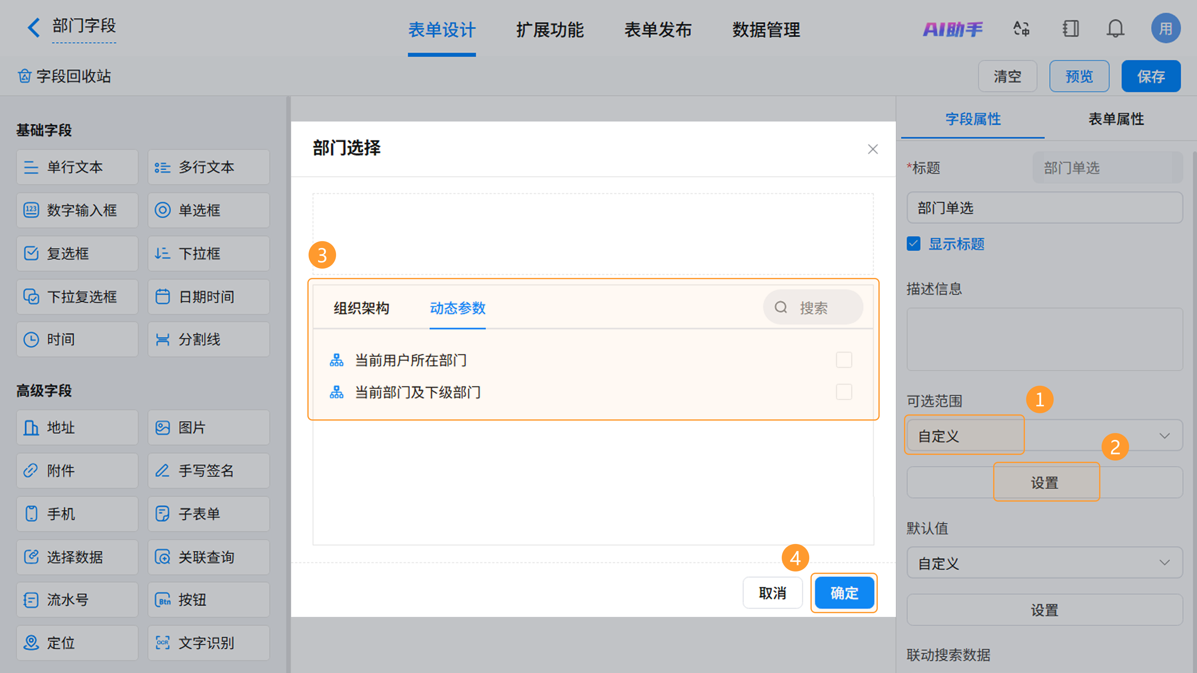 - 动态参数:根据填表人的身份,自动筛选「当前用户所在部门」或「当前部门及下级部门」。