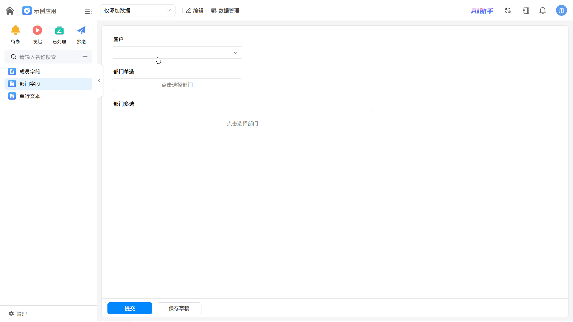 - 部门单选:填写时仅允许选择一个部门。适用于业务归属明确、单一部门负责的场景。