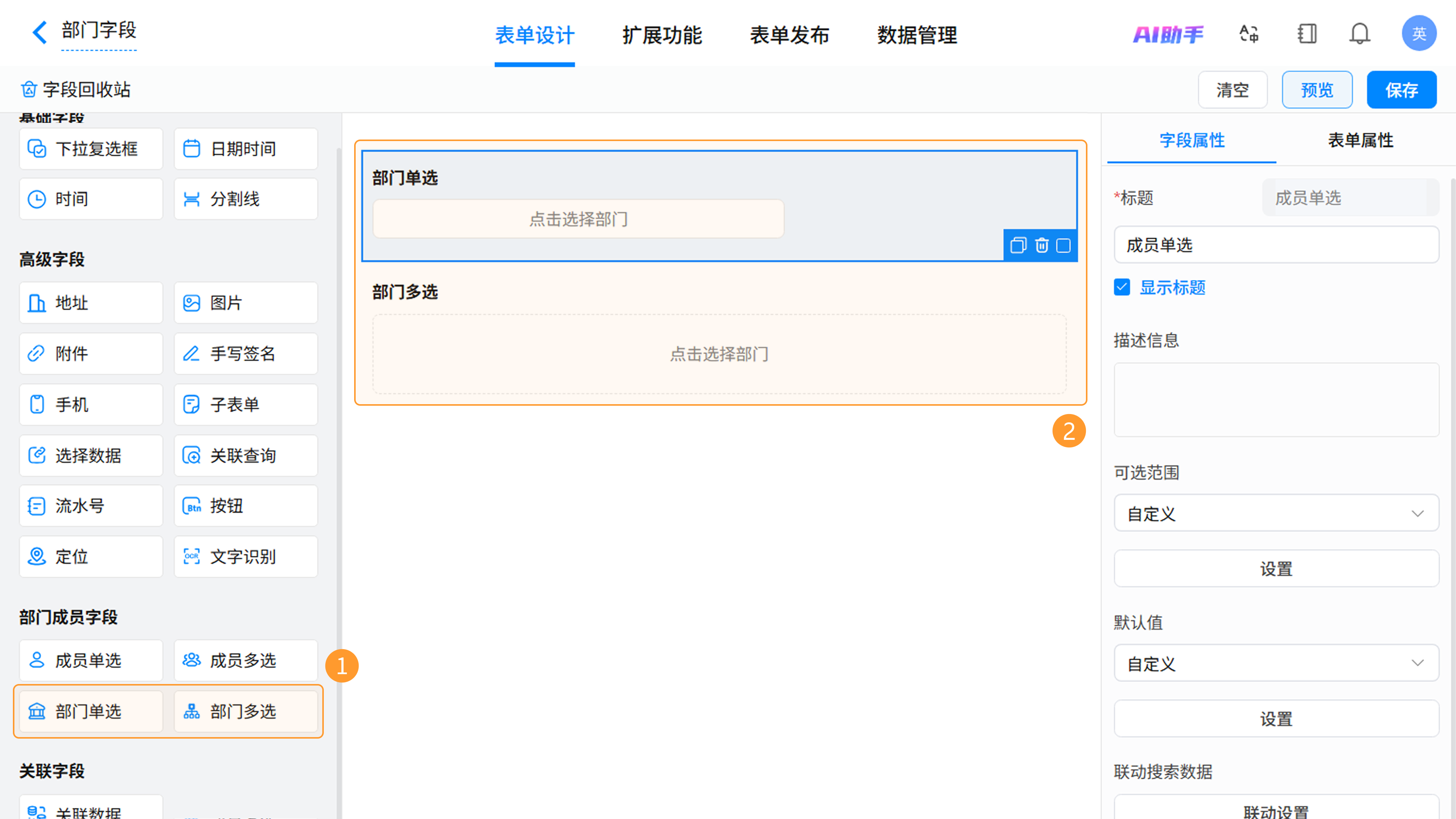 设置路径:在表单设计页面,从左侧字段区拖拽或点击即可添加「部门」字段,在右侧属性区进行配置。