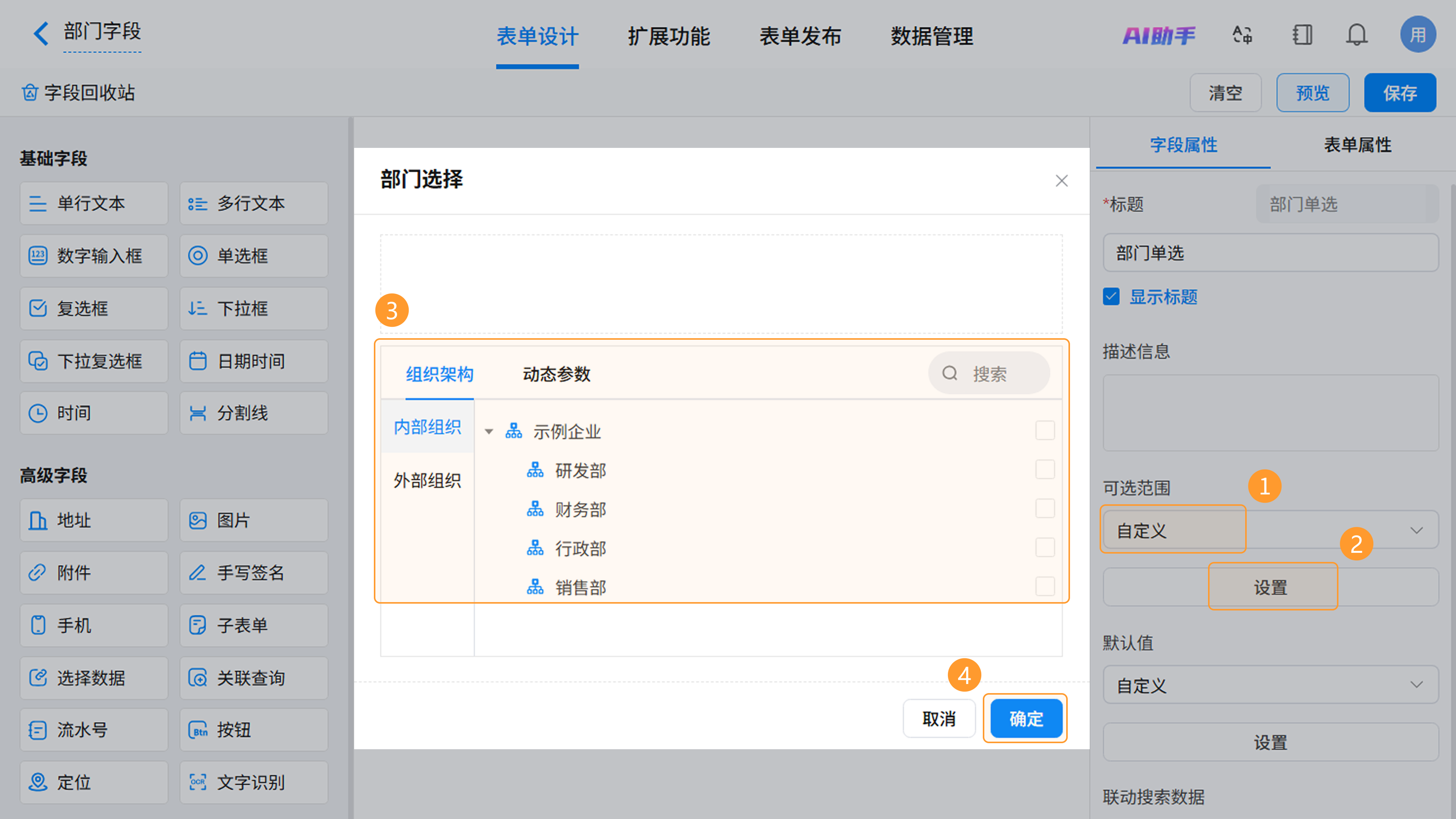 可选范围决定了用户填表时能看到哪些部门,可点击「字段属性」>>「可选范围」进行精确限定。