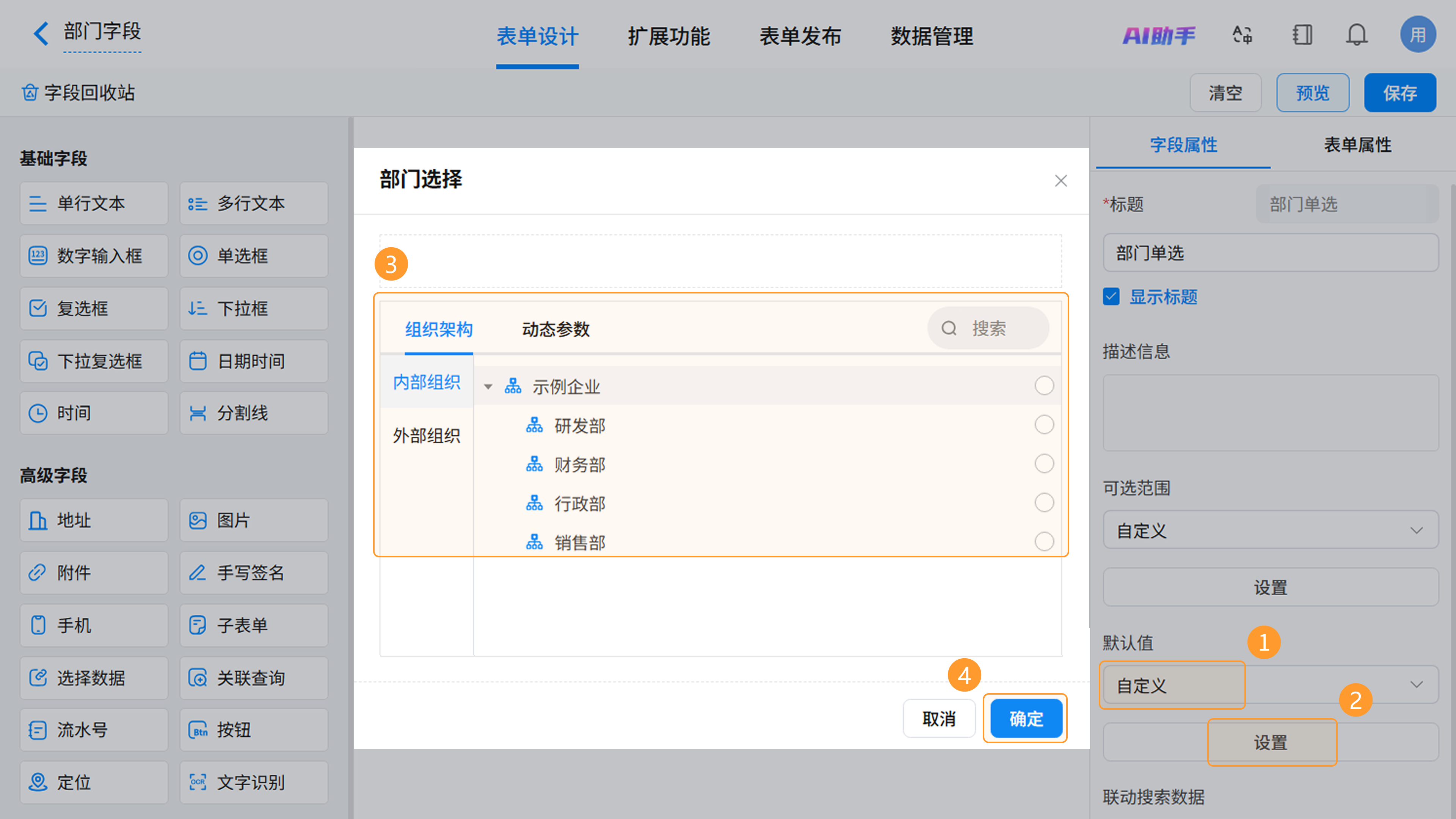 本文主要介绍部门字段的特有属性,通用属性设置可查看:字段属性。