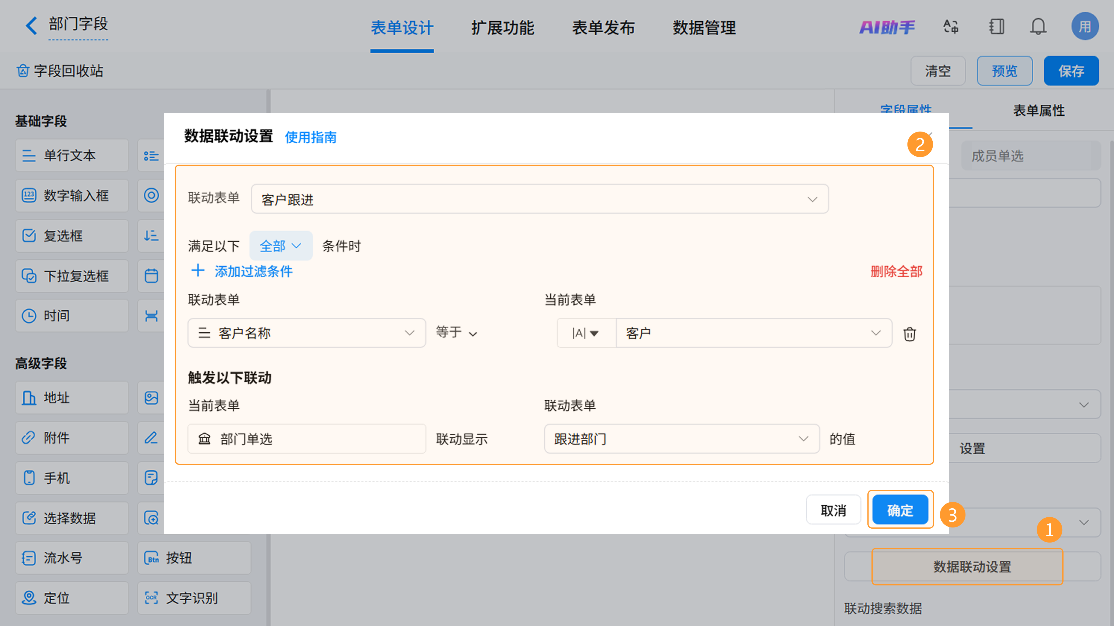当满足特定触发条件时,自动从其他表单中提取对应的部门字段数据。具体操作详见:数据联动。