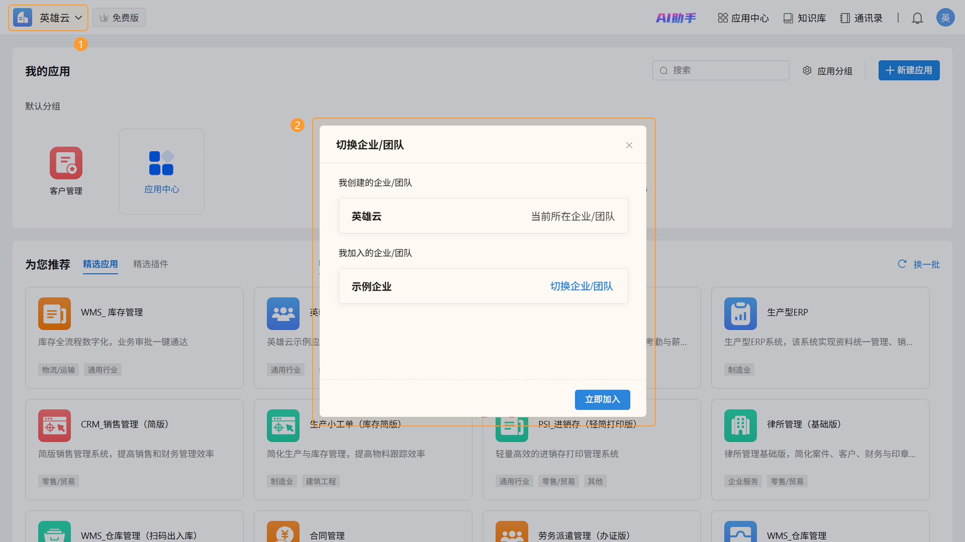 点击“加入企业/团队”,在弹窗中输入对方分享的邀请链接加入对应的企业或团队。