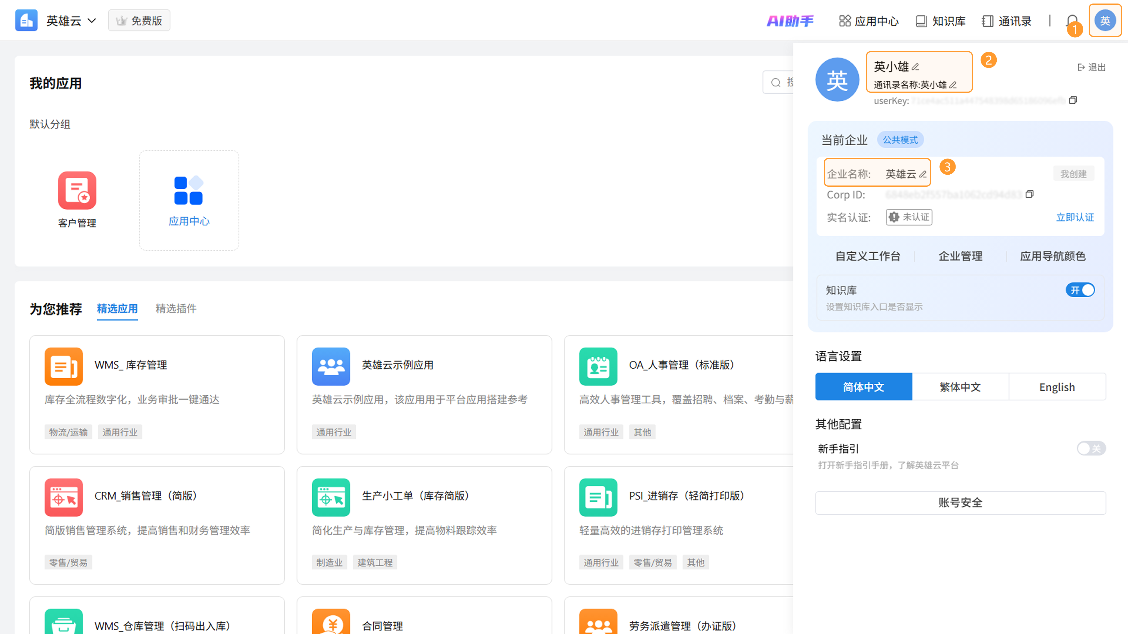 进入工作台后,可以点击右上角头像,打开个人中心侧边栏。在侧边栏中,用户可以修改账号昵称、通讯录昵称、企业名称等信息。