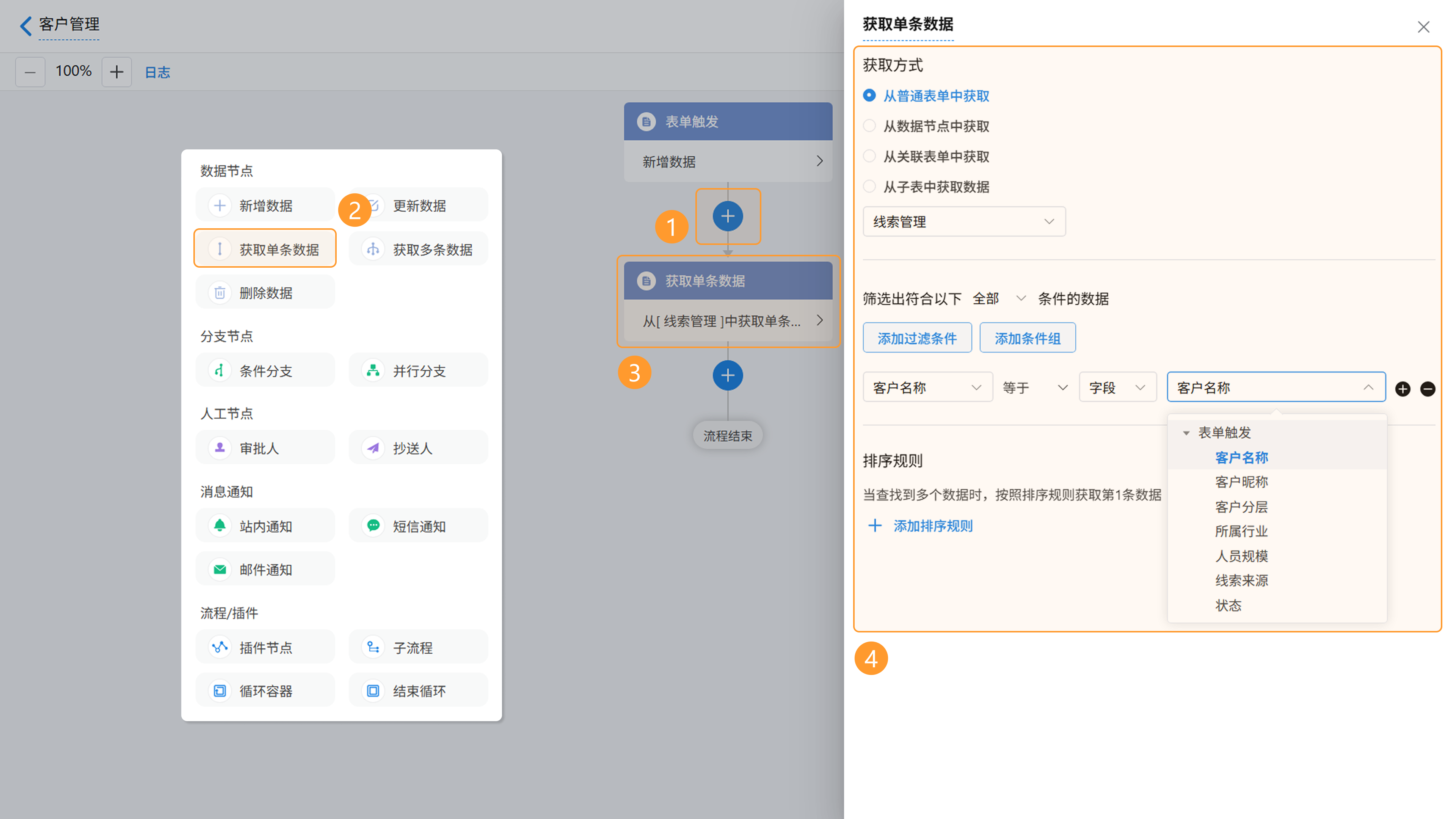 2)节点配置:点击该节点,获取方式选择“从普通表单中获取”,目标表单选择“线索管理”,