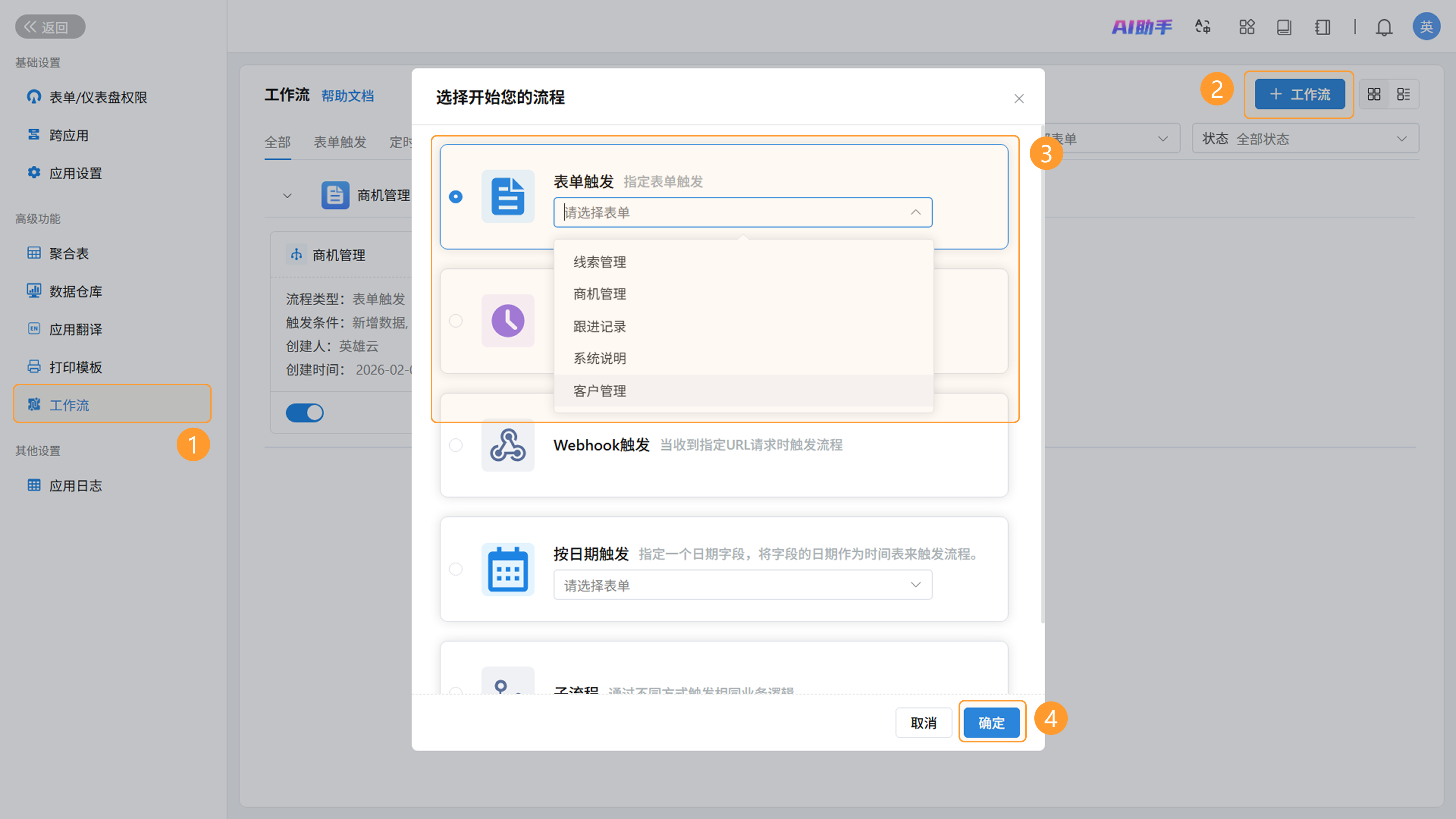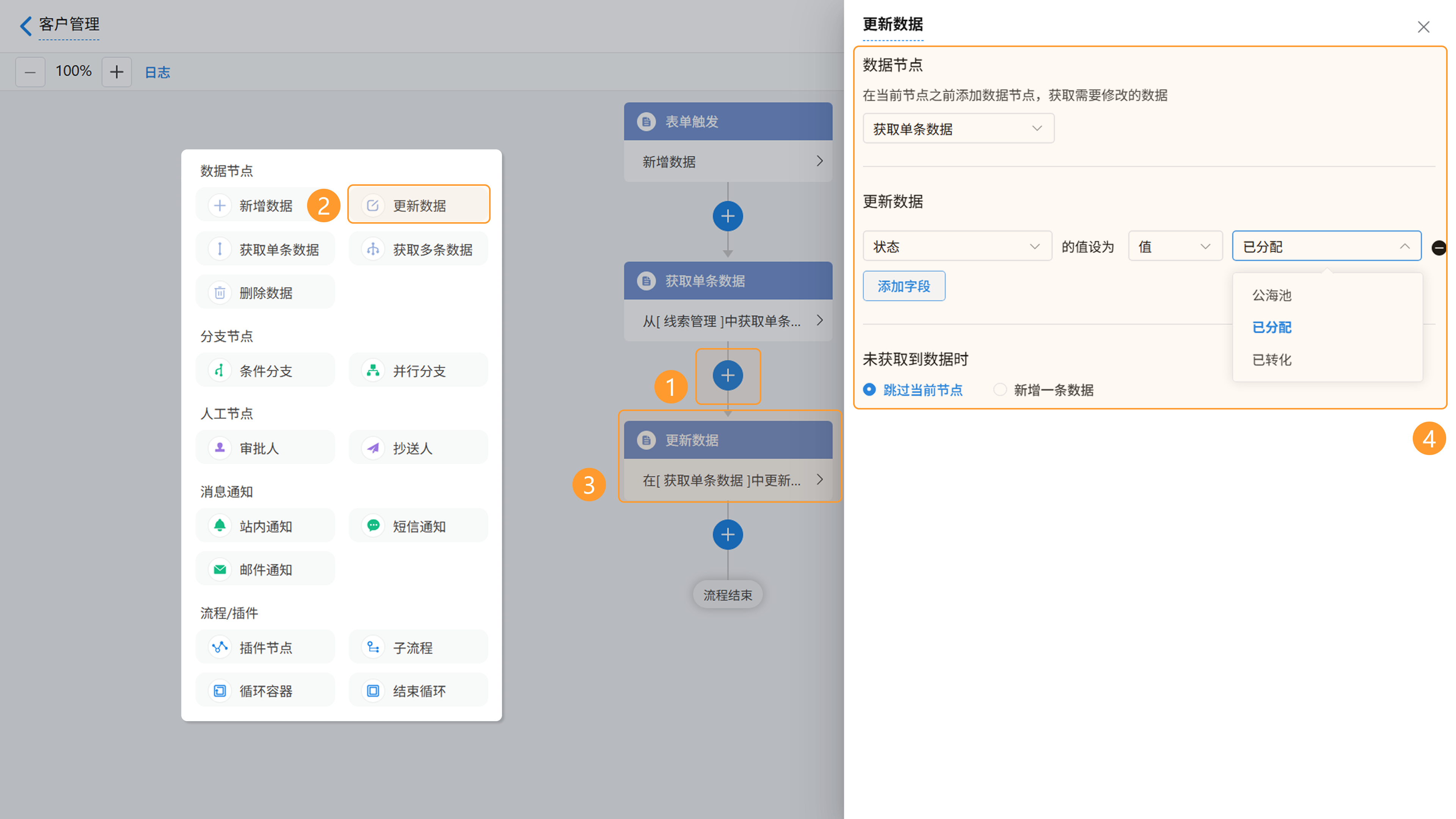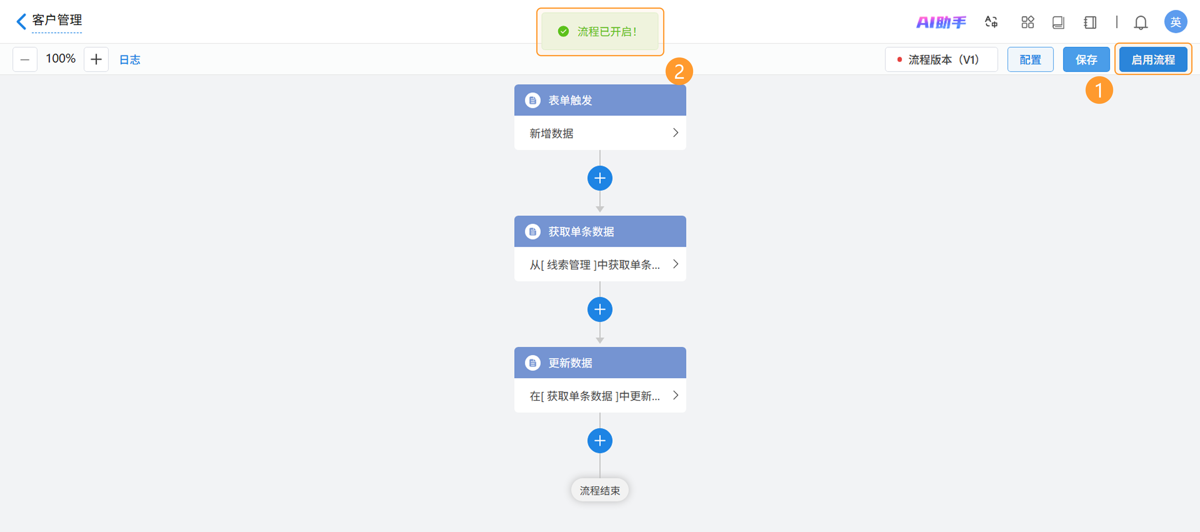 本章节将以“新增客户后自动更新线索分配状态”这一场景为例,详细拆解工作流的配置步骤。