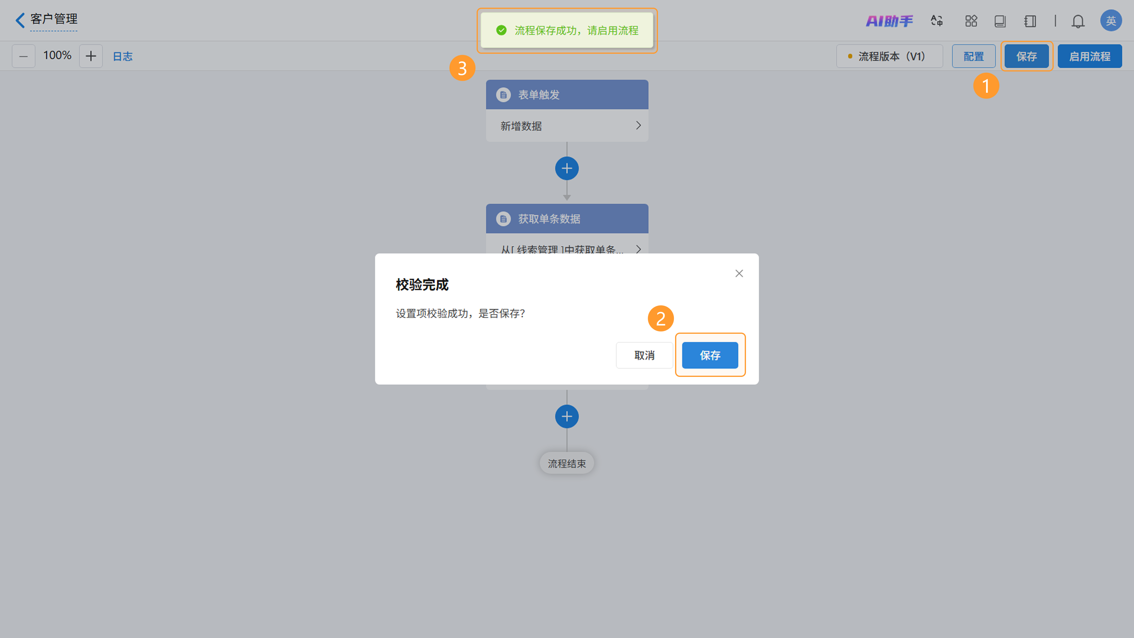 流程设计完成后,点击页面右上角的「保存」 按钮,系统将自动校验节点配置,校验无误后,点击弹窗中的「保存」,系统上方会弹出“流程保存成功,请启用流程”的提示。
