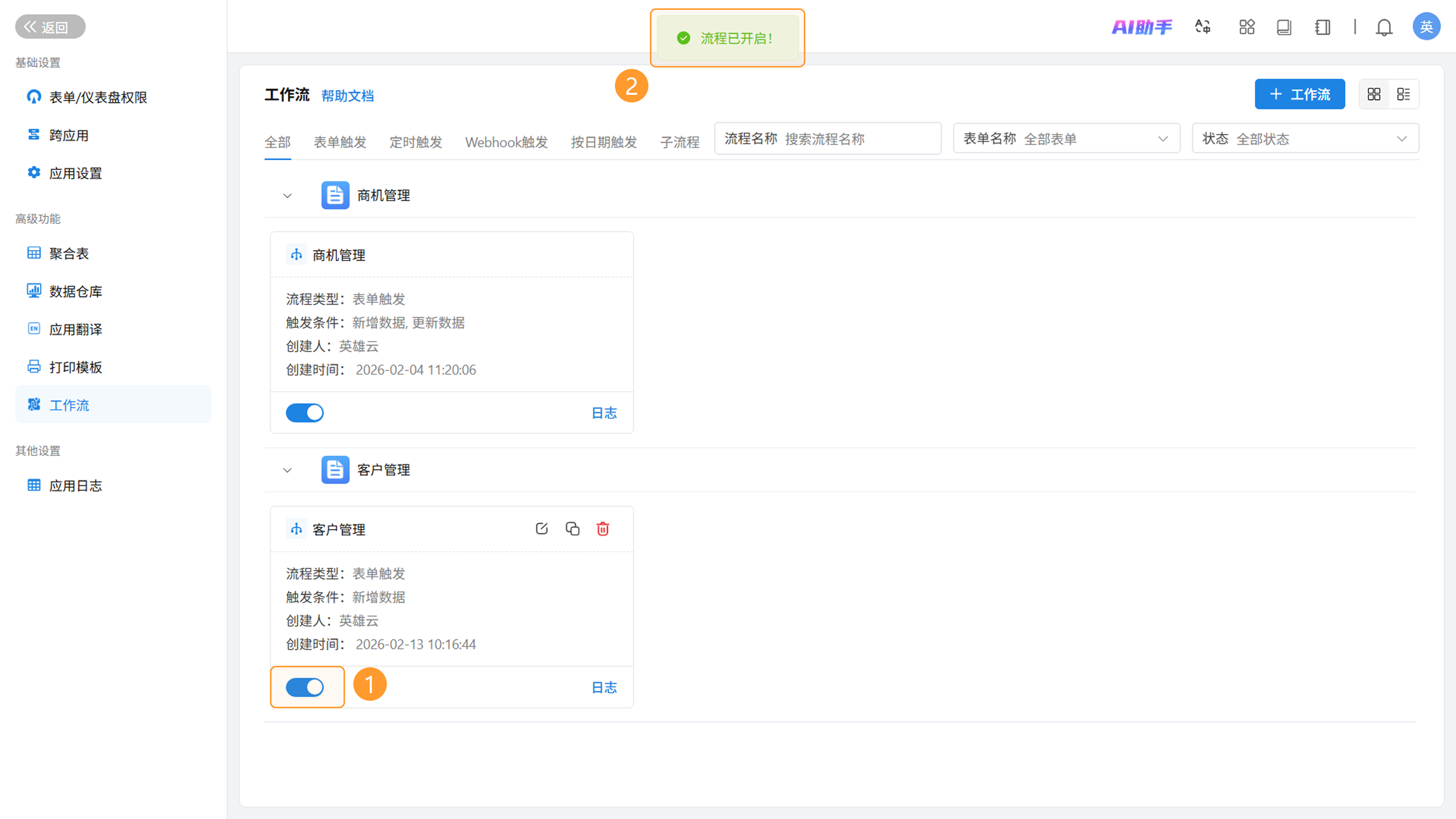 - 在工作流列表页面,找到该流程并拨动「状态」开关至开启位置