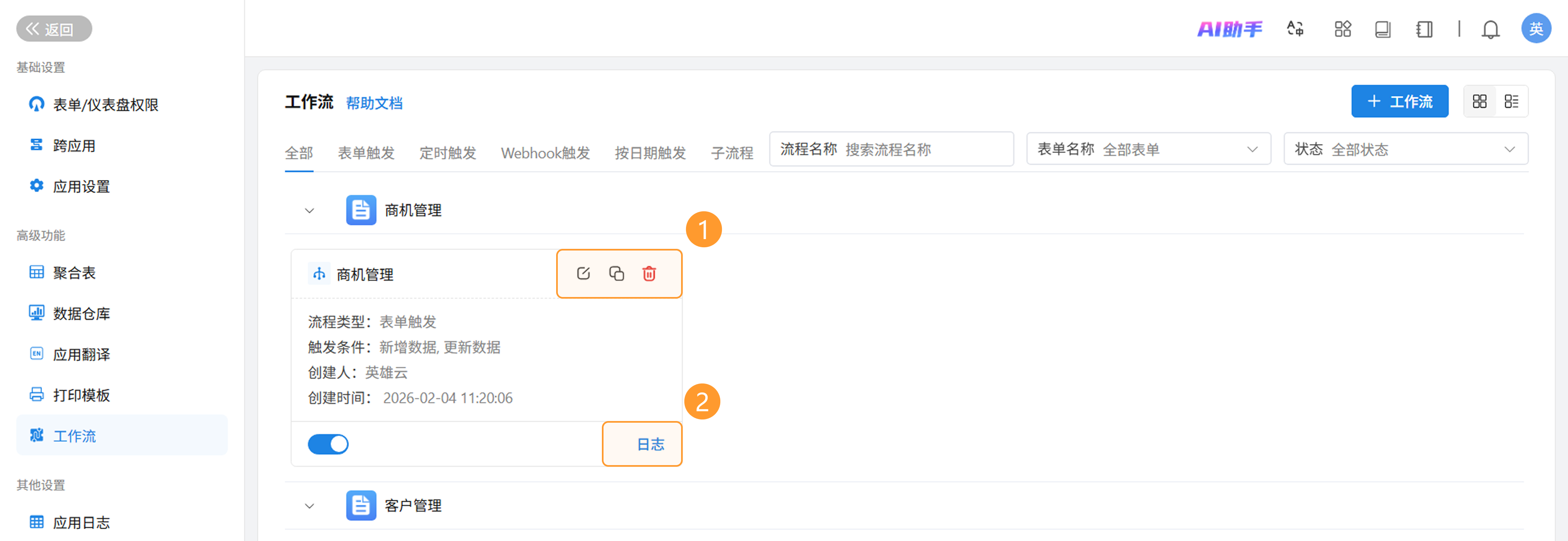- 触发表单:「客户管理」