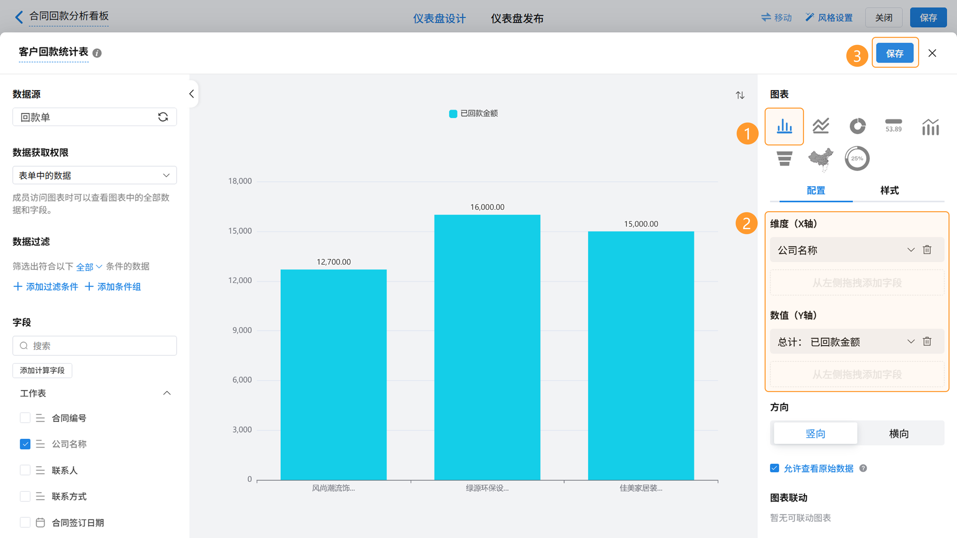 此时中间预览区将自动生成以“公司名称”为横坐标、“已回款金额”为纵坐标的柱状图。完成后点击右上角 「保存」,返回仪表盘页面。