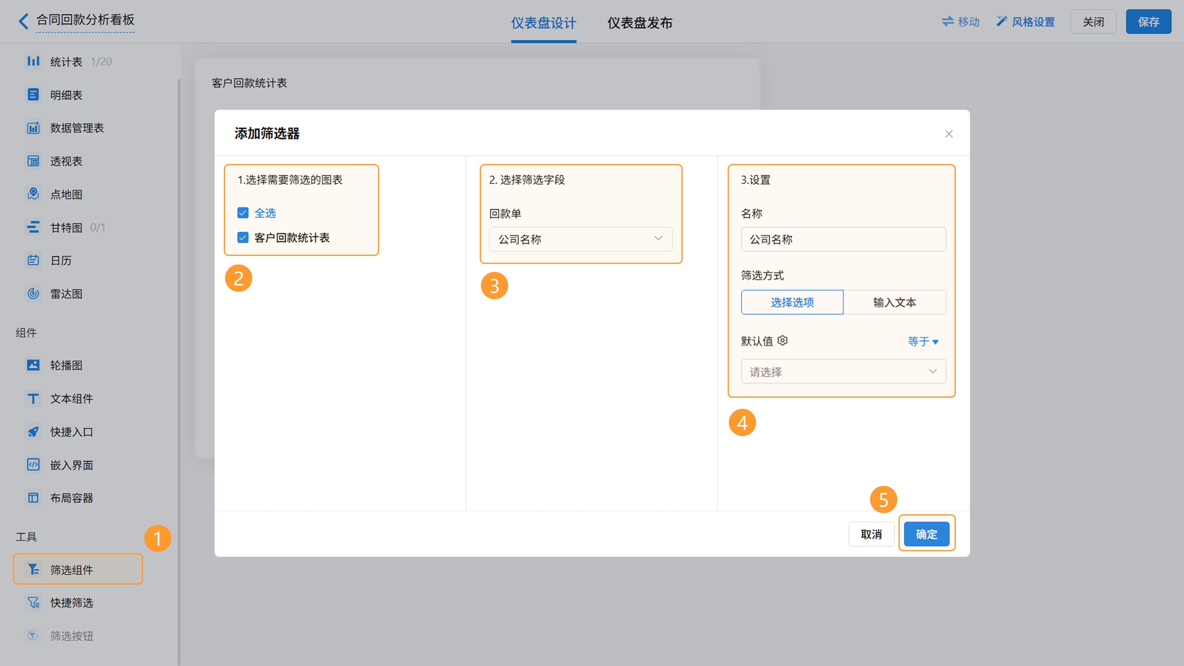 2)配置图表:在弹窗中勾选需要筛选的图表(此处选择上一步创建的“客户回款统计表”);选择筛选字段为“客户名称”;筛选方式选择“选择选项”,完成后点击右下角 「确定」,返回仪表盘主页面。