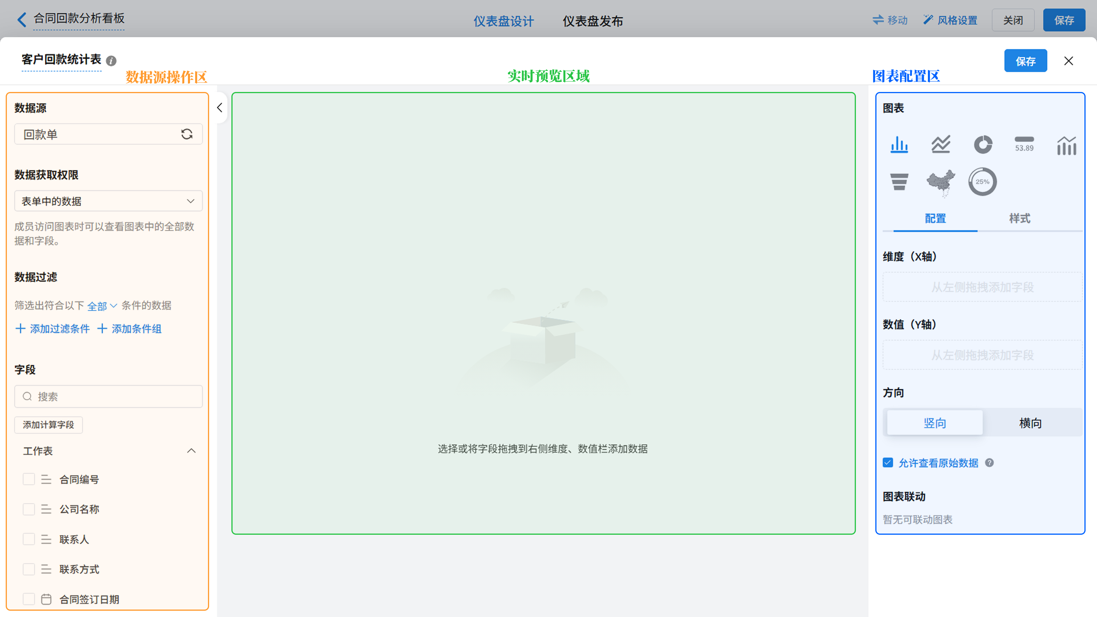 进入编辑页面后,重命名为“客户回款统计表”,配置界面分为三部分:左侧为数据源操作区,右侧为图表配置区,中间为实时预览区。