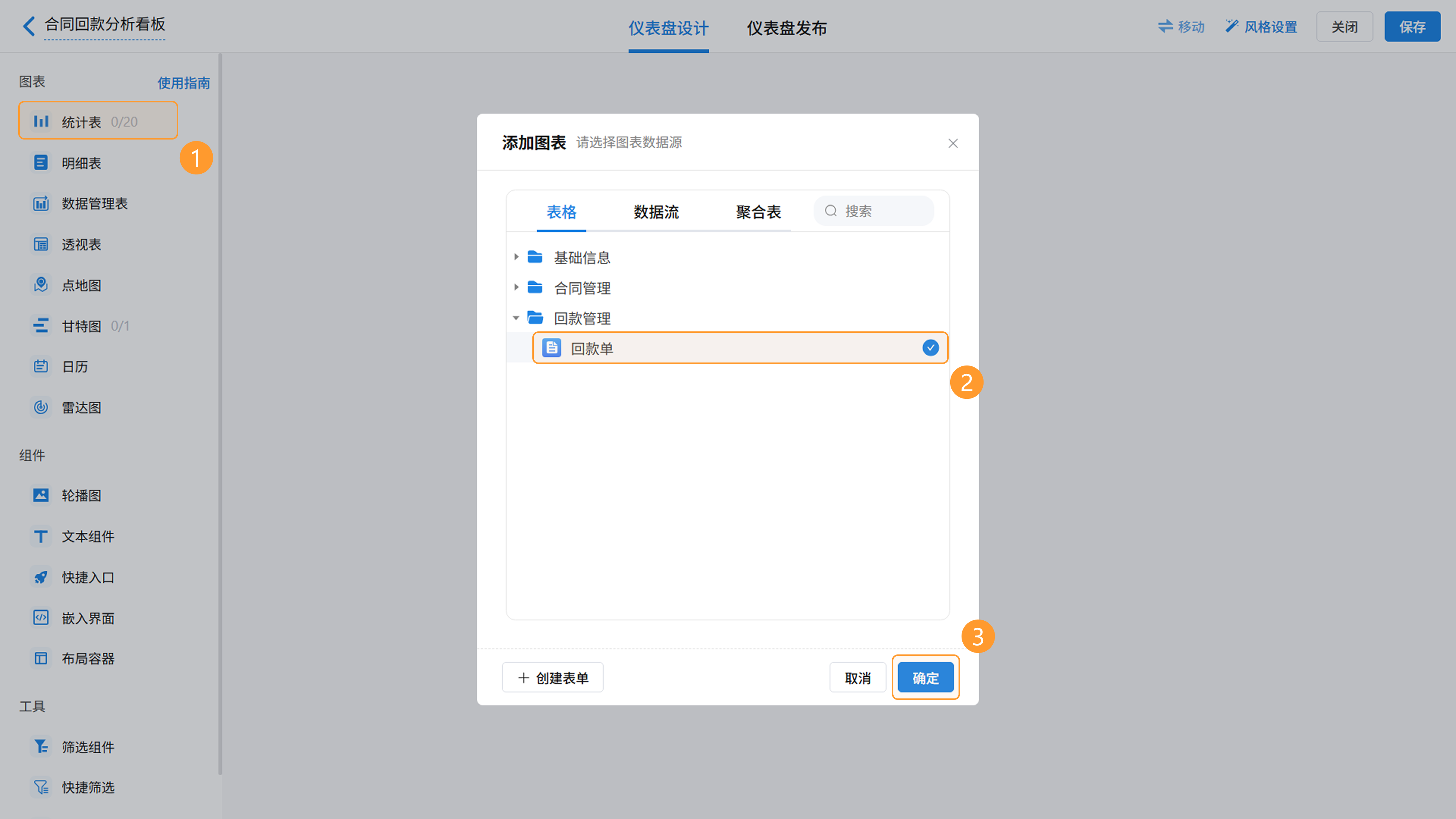 2)关联数据源:在弹窗中选择“回款单”表单,点击「确定」。
