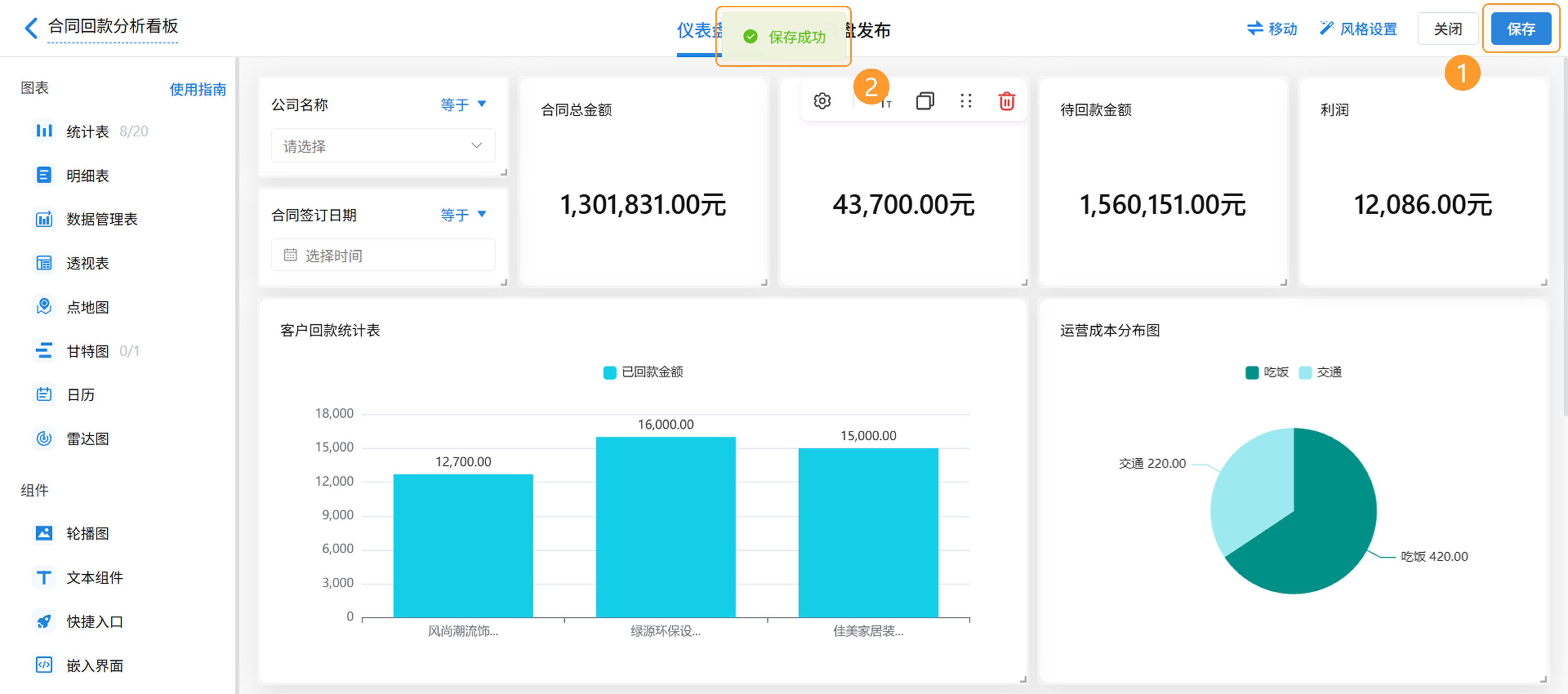 一个仪表盘可以添加多个图表、工具和组件,在仪表盘画布上可自由拖拽,调整至合适的排列位置。点击右上方的「保存」,系统上方出现“保存成功”提示。