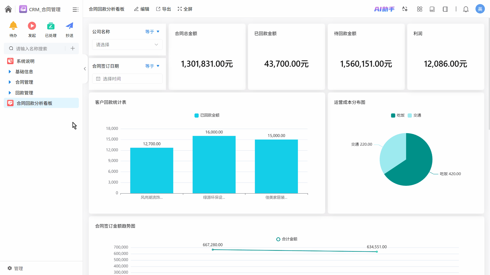 - 销售管理:实时分析合同回款率、销售漏斗转化及员工业绩排行
