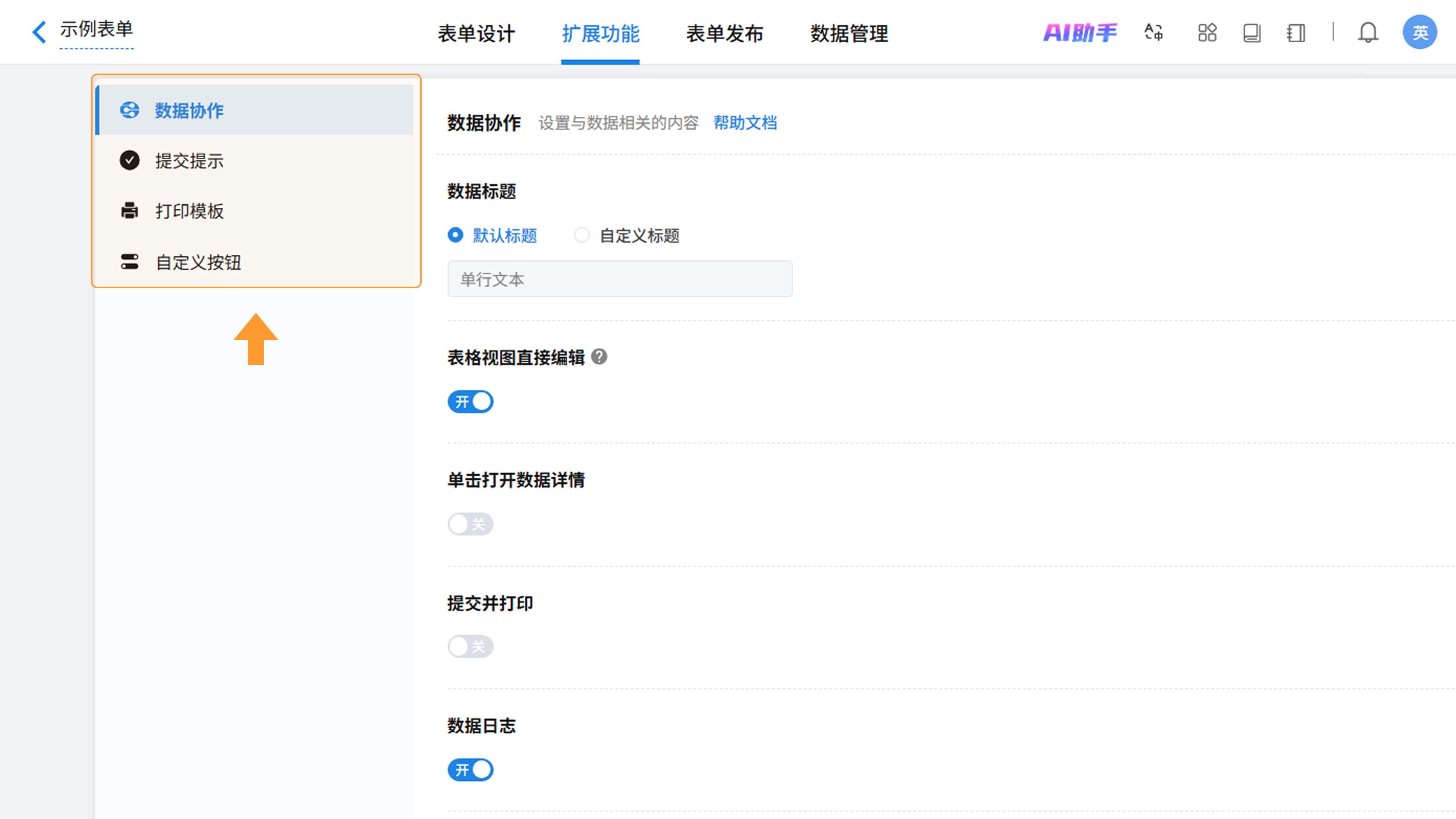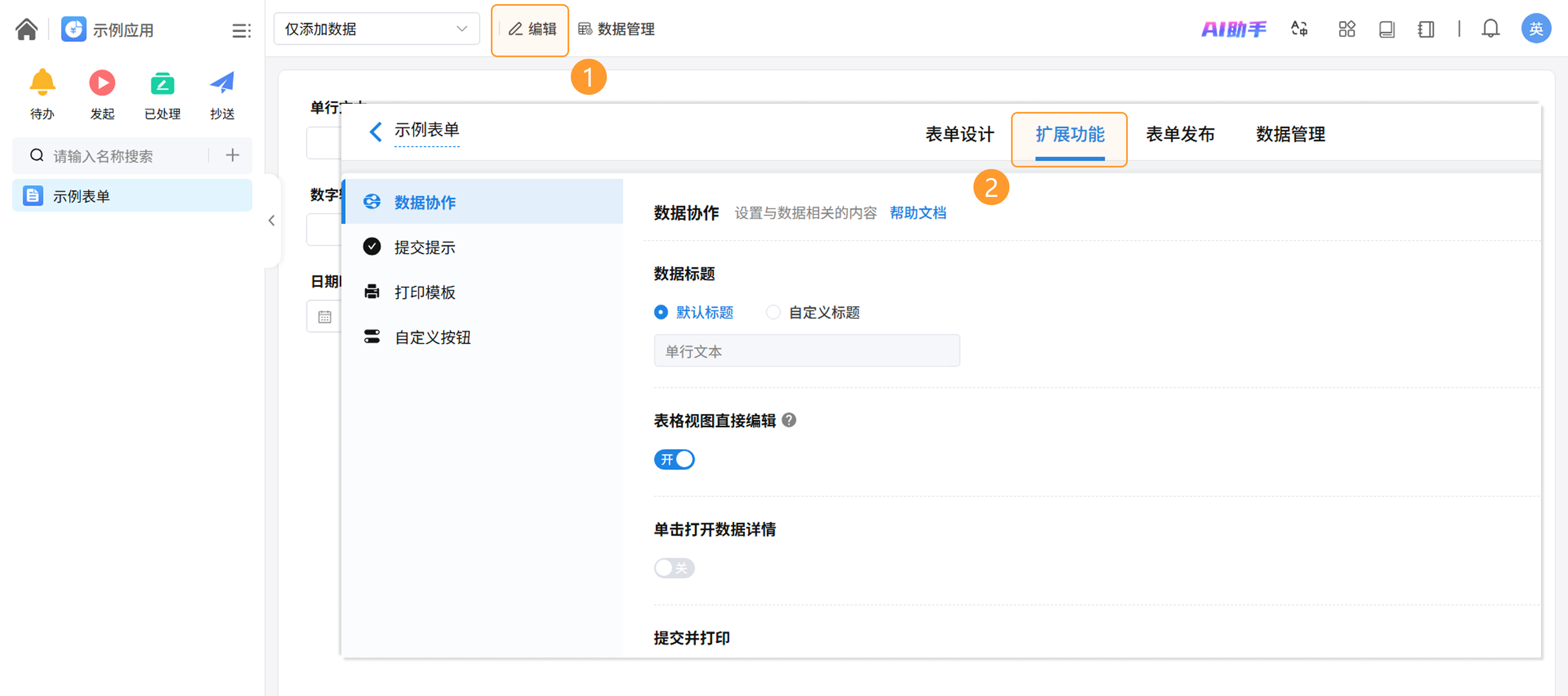 完成表单基础设计后,您可以通过扩展功能为表单配置数据标题、提交提示、自定义按钮及打印模板等高级属性,全方位提升表单的业务承载能力与交互体验。