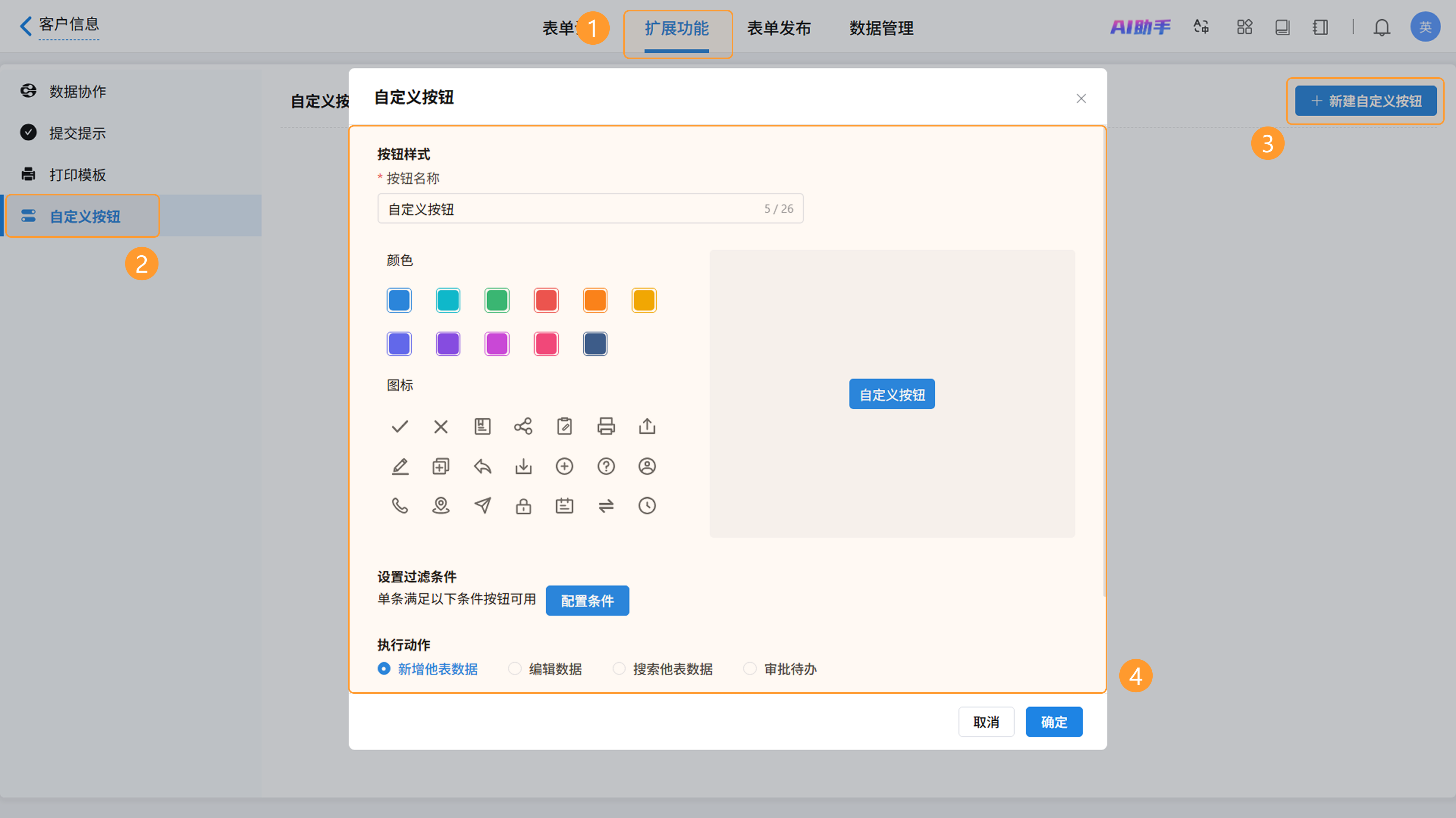 操作路径:进入目标表单「编辑」页 >> 点击上方 Tab 栏「扩展功能」>> 在左侧菜单选择「自定义按钮」>> 点击「+ 新建自定义按钮」。