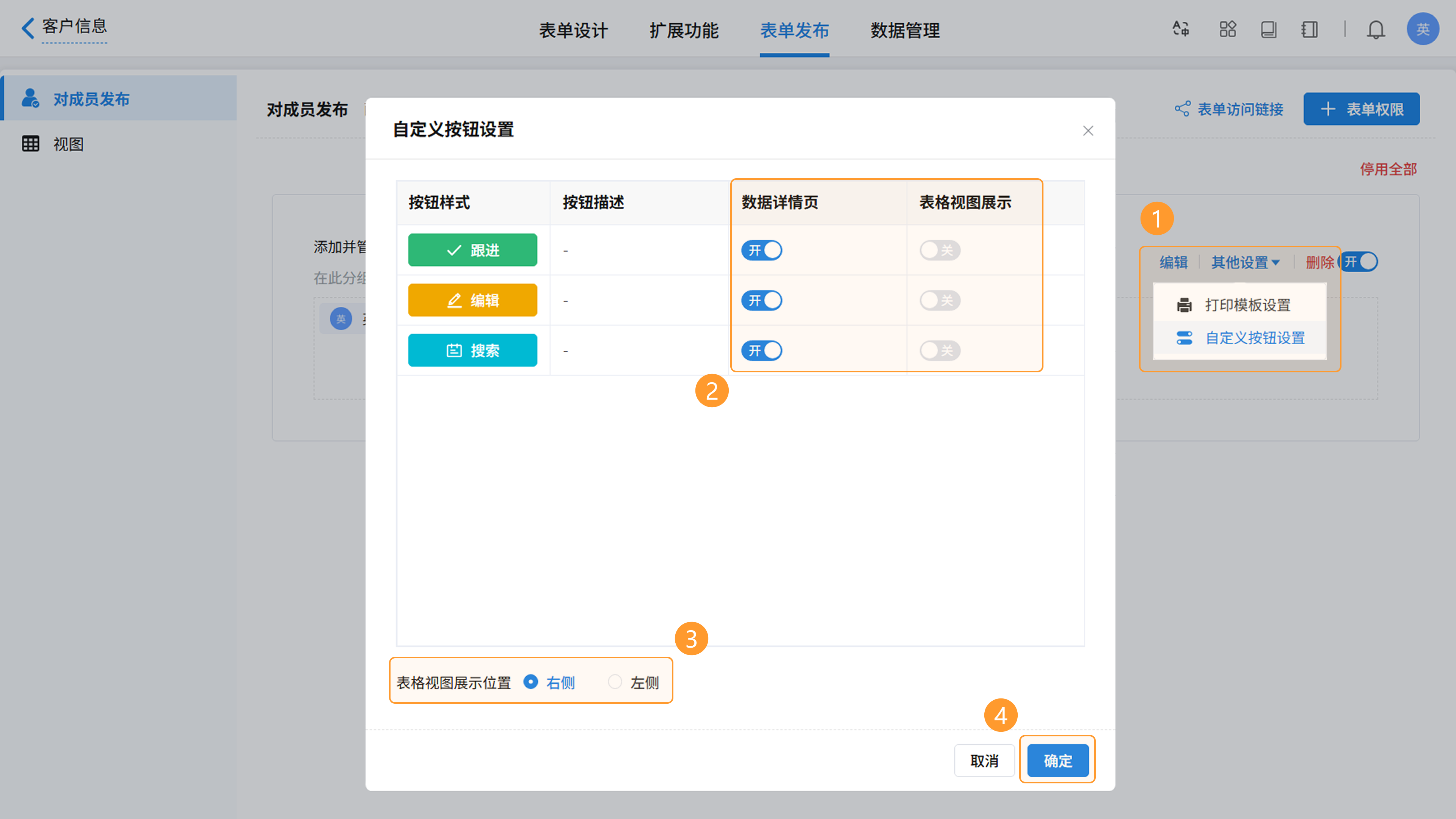 自定义按钮相当于一个业务触发器,成员可在数据详情页或表格视图中点击按钮,快速执行对应的表单操作,从而完成业务处理并实现功能扩展。