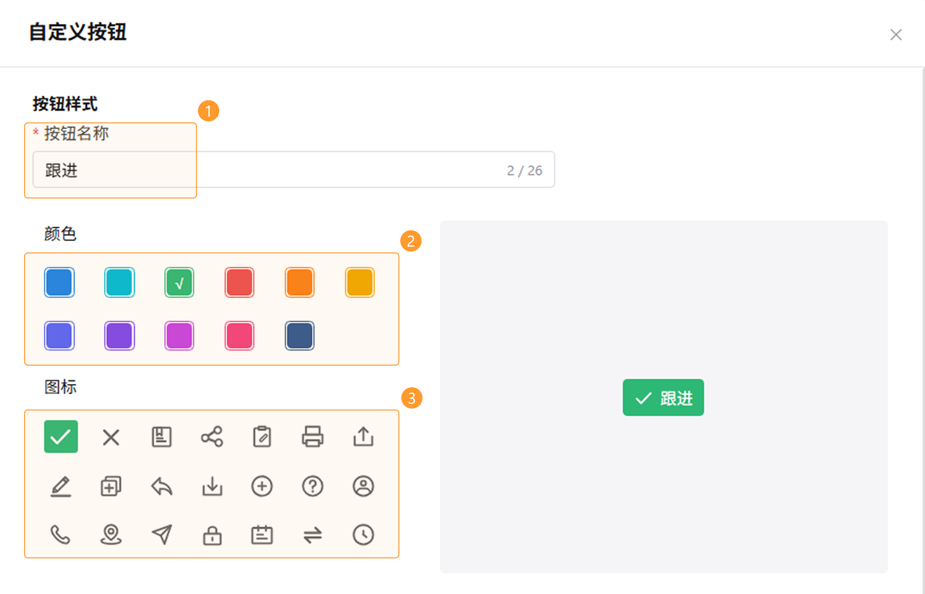 1)设置名称:支持自定义按钮名称(上限26字符)。此处设置为“跟进”。