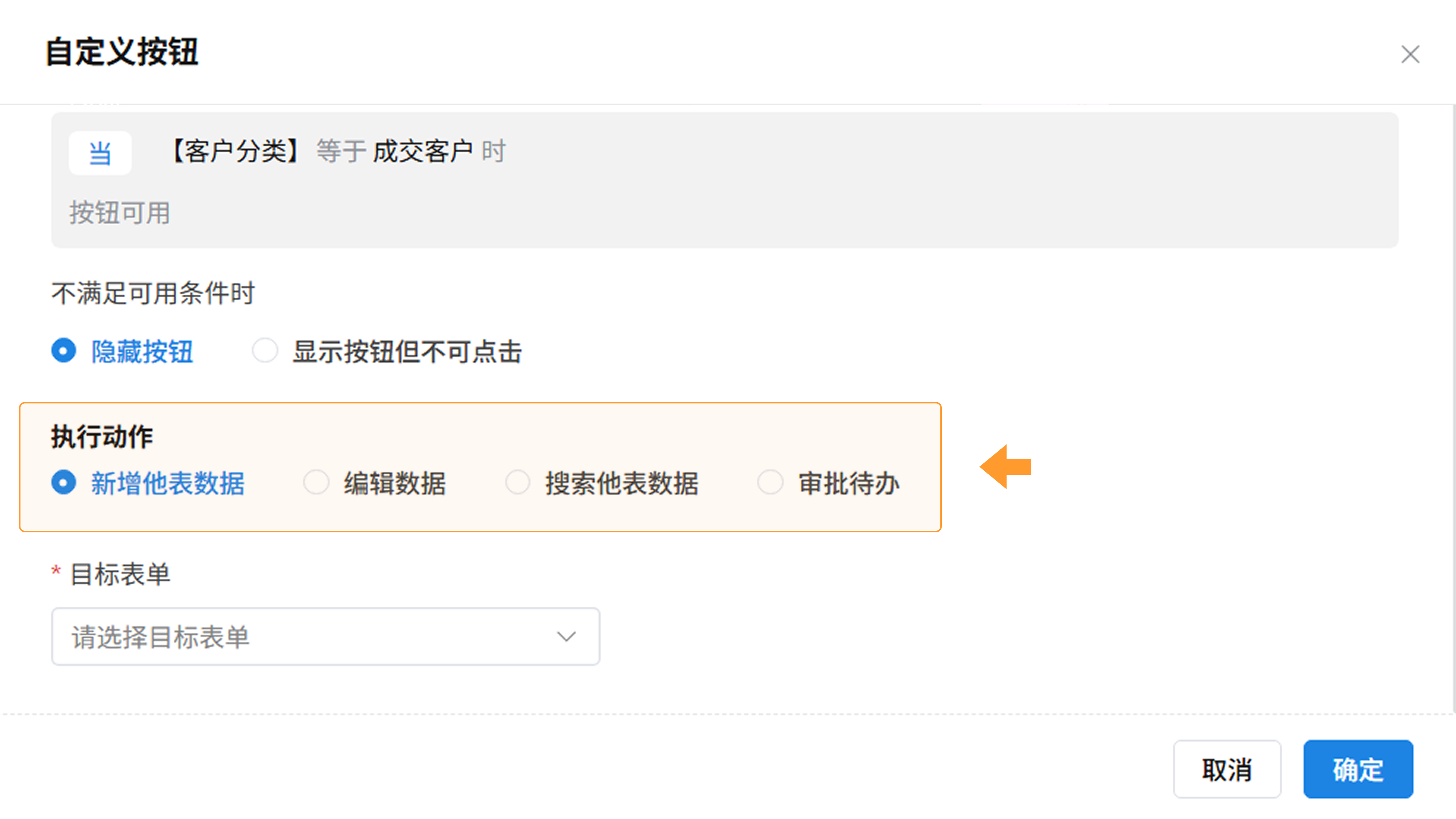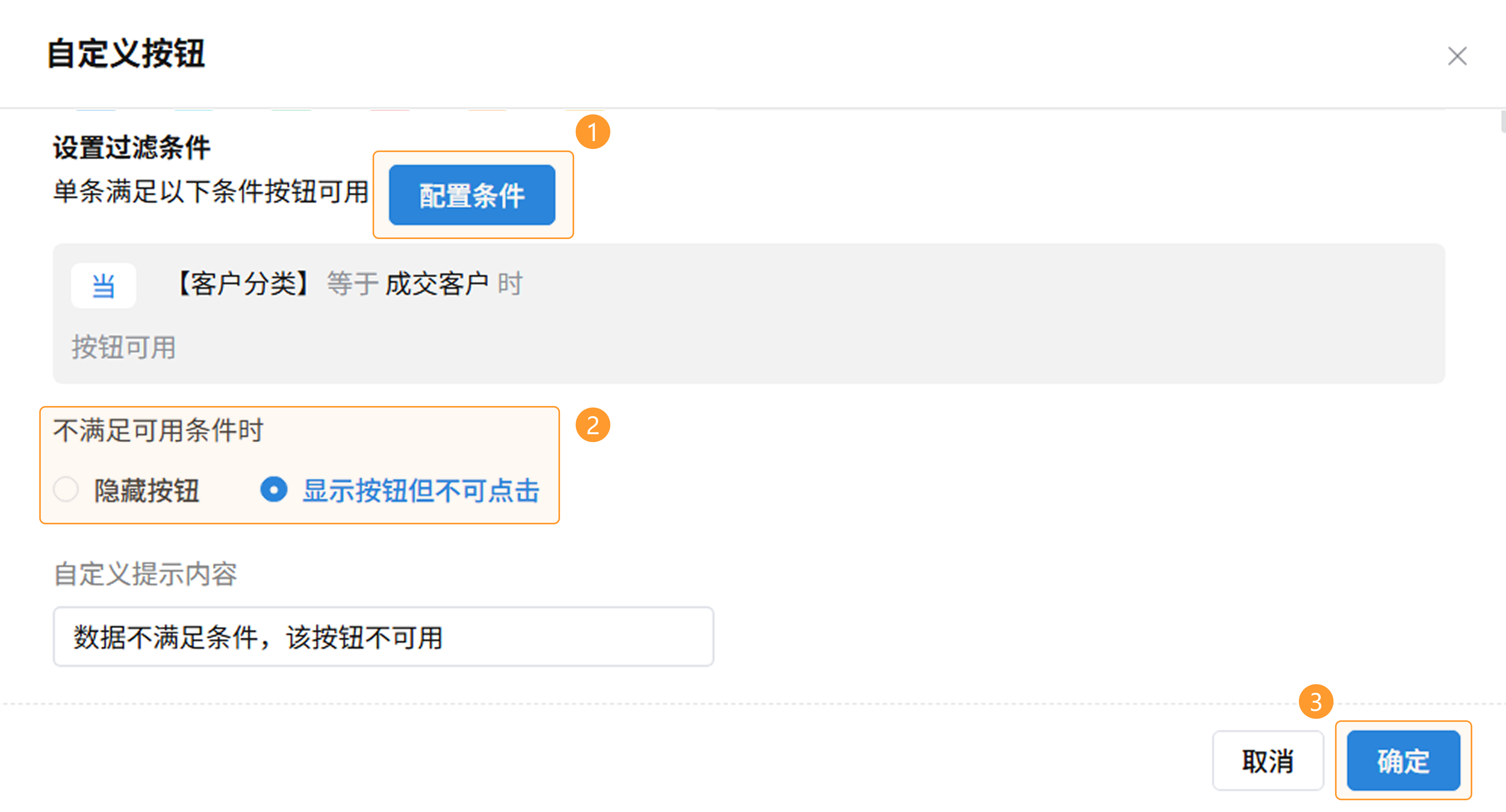 示例:此处设置过滤条件为「客户分类」字段值等于「成交客户」,若不满足,则提示“数据不满足条件,该按钮不可用”。