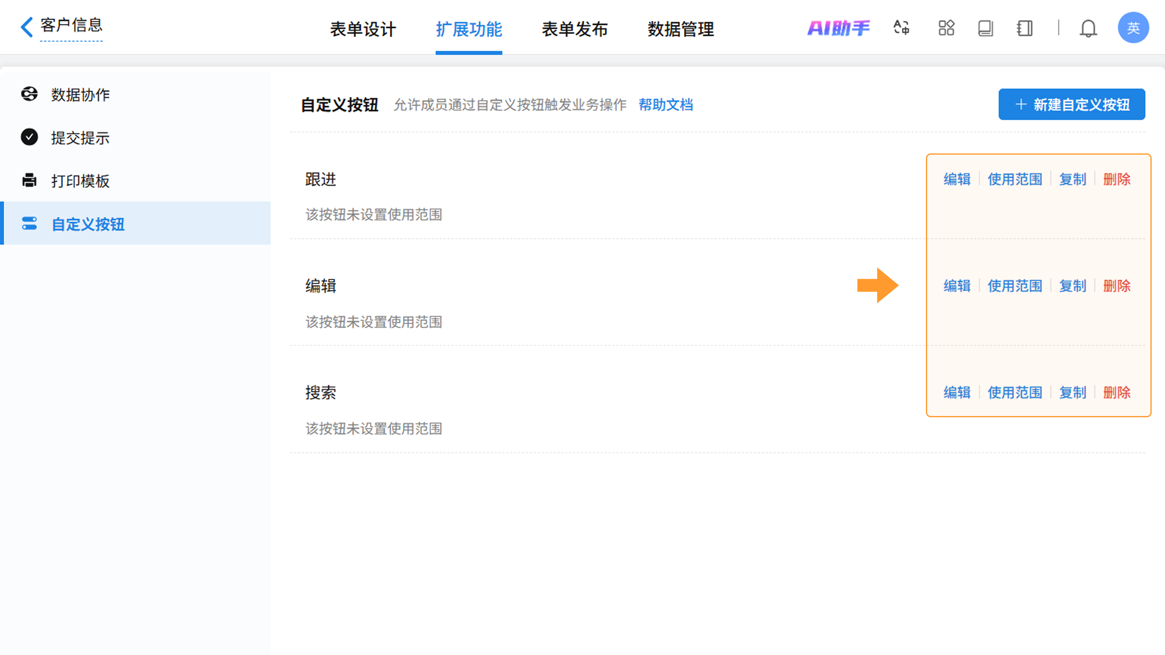 在「扩展功能」 >> 「自定义按钮」列表中,点击对应按钮右侧的操作图标即可执行编辑、复制或删除;同时支持通过拖拽方式对按钮进行排序。