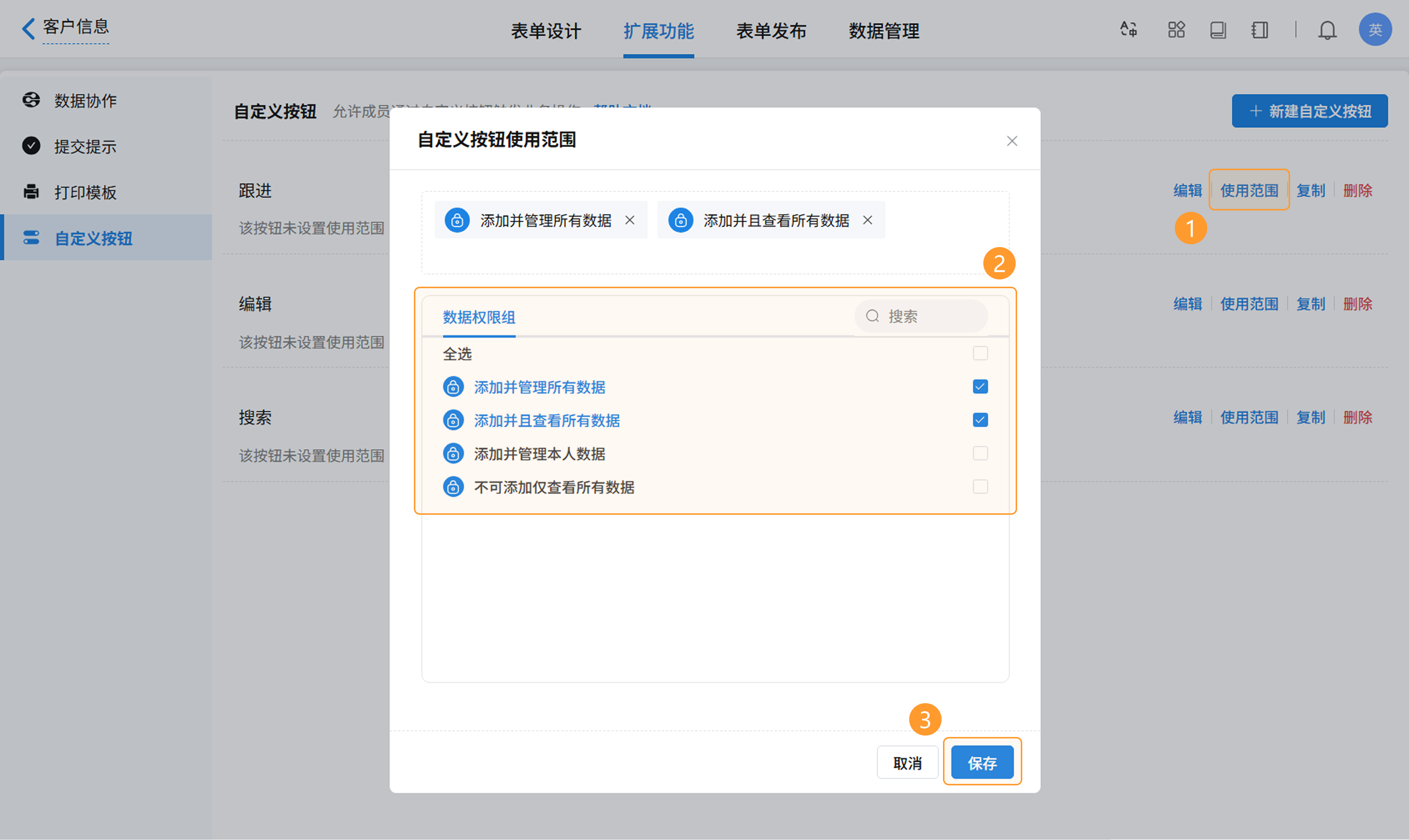 在「扩展功能」 >> 「自定义按钮」列表中,点击自定义按钮右侧的「使用范围」,勾选允许使用该按钮的权限组后点击「保存」。