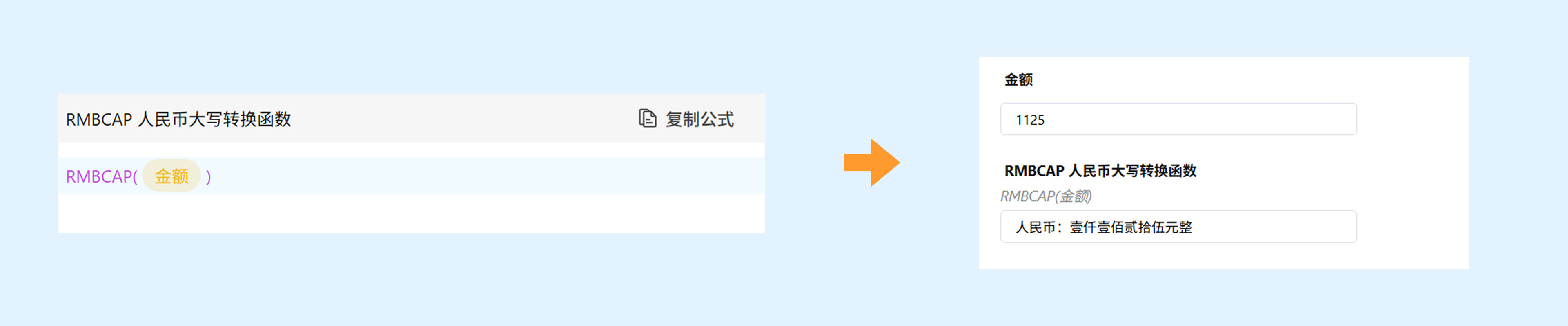 示例:RMBCAP(金额),金额输入“1125”,返回“人民币:壹仟壹佰贰拾伍元整”。