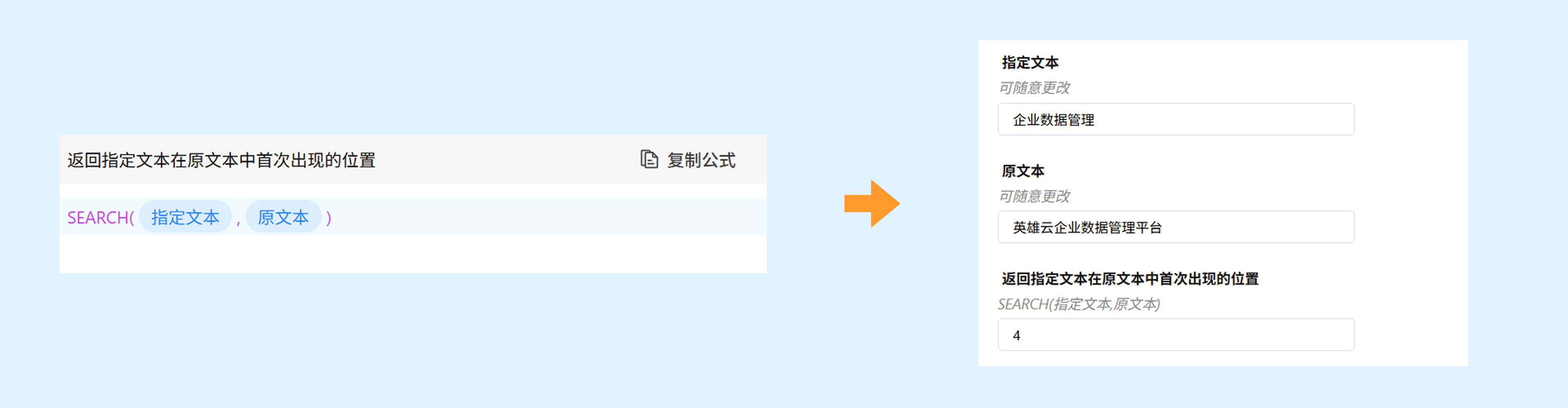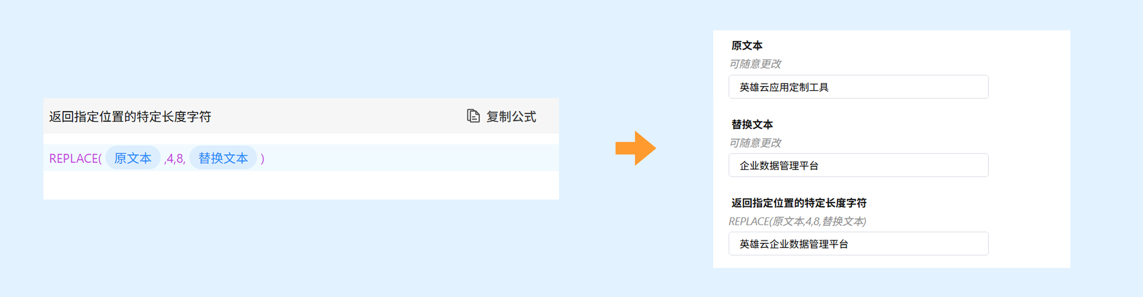 示例:REPLACE(原文本,4,6,替换文本),原文本输入"英雄云应用定制工具",替换文本输入"企业数据管理平台",返回"英雄云企业数据管理平台"。