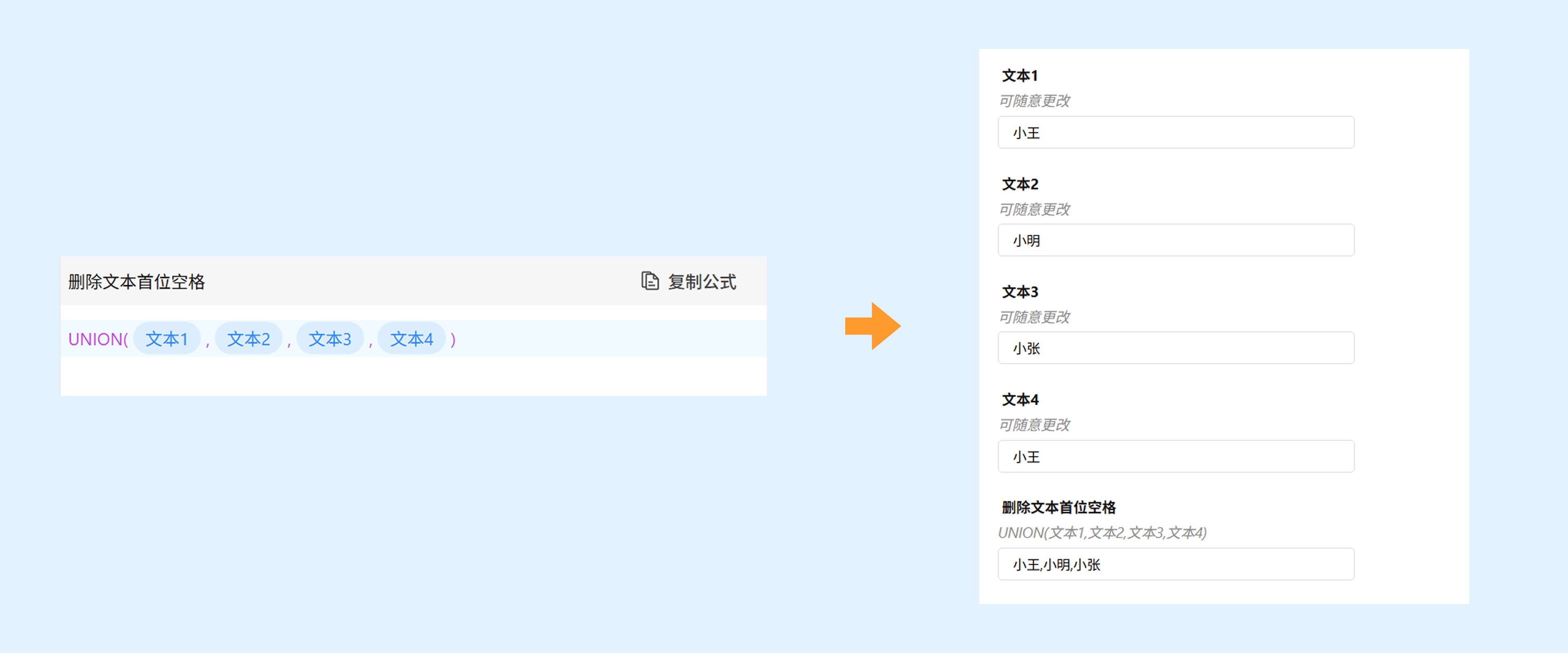 功能:UNION 函数可合并多个文本数组并自动剔除重复值。