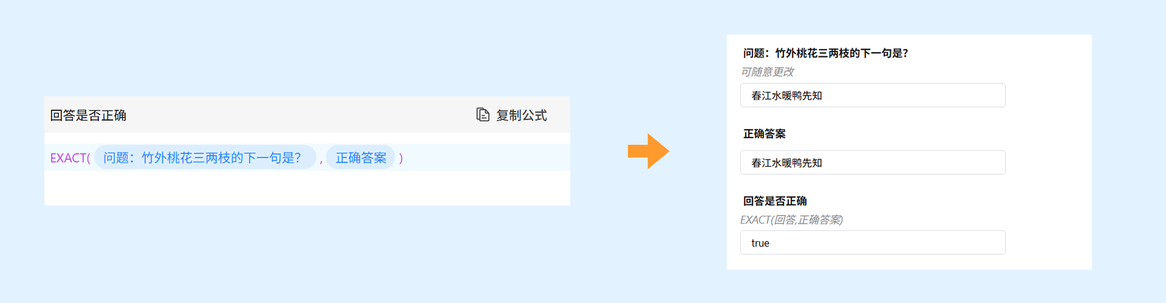 功能:EXACT 函数可以比较两个文本是否完全相同,完全相同则返回true,不同则返回false。EXACT函数可搭配IF函数使用,判断答题者回答情况是否正确。