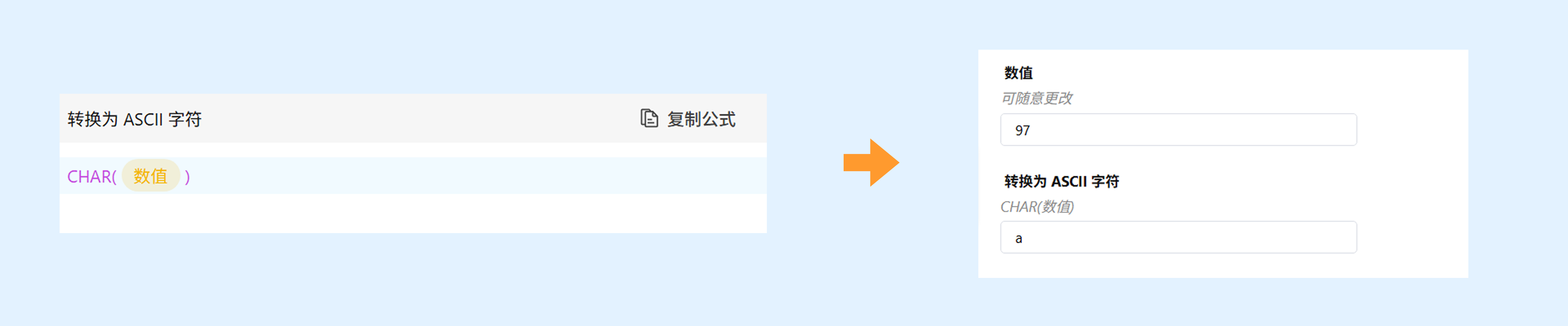功能:CHAR 函数可以将数字代码转为 ASCII 字符。具体对照可查看:ASCII表。
