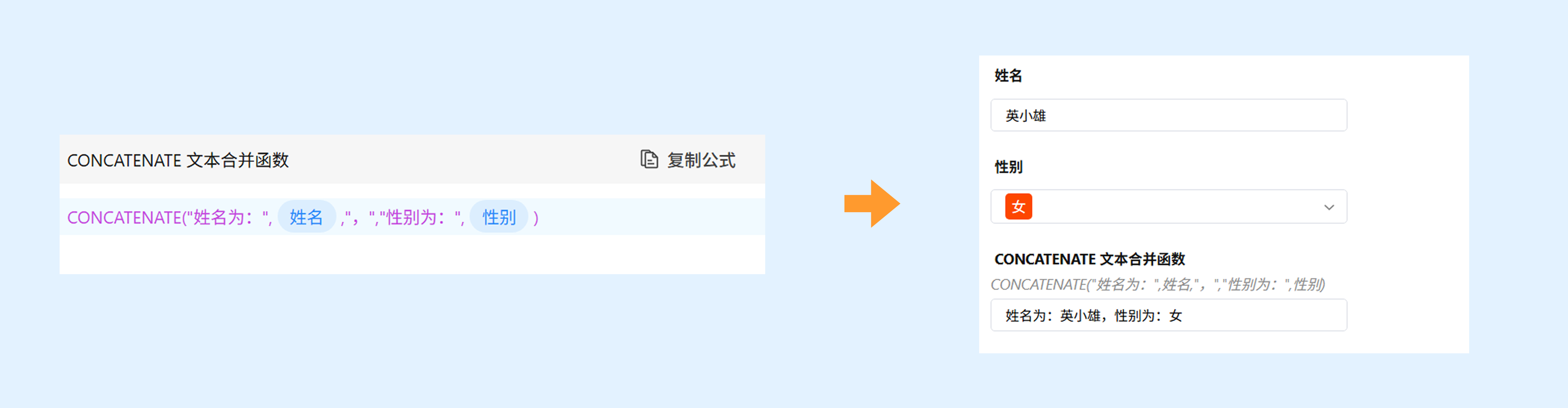 示例:CONCATENATE("姓名为:",姓名,",","性别为:",性别)
