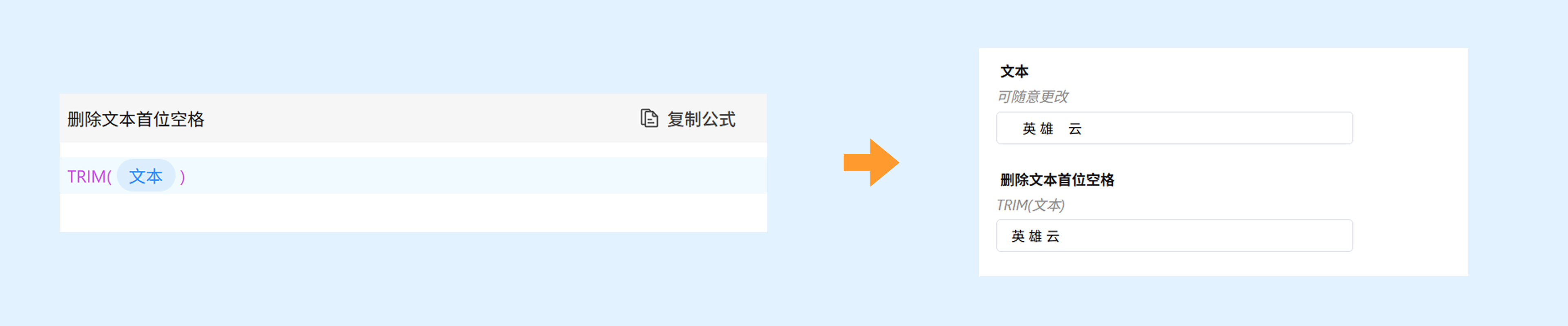 功能:TRIM 函数可以删除文本首尾的空格。若文本中存在连续的多个空格,则删除至剩余一个空格。