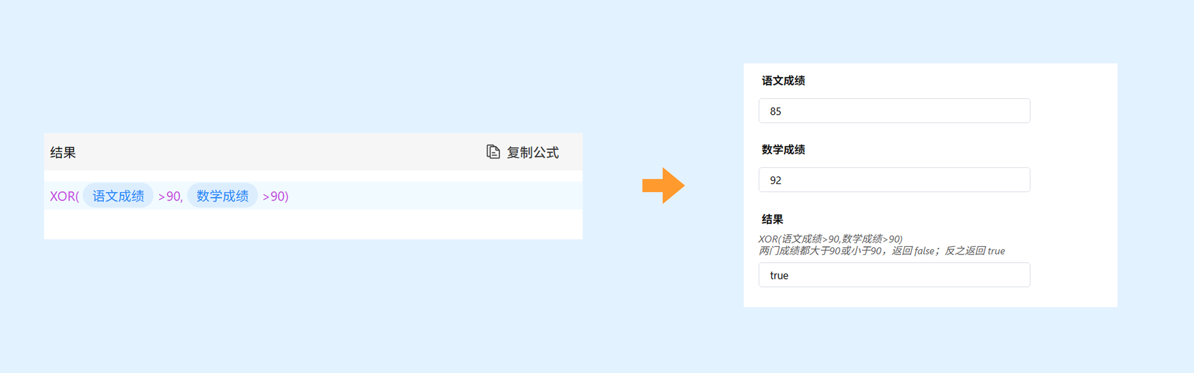 示例:XOR(数学成绩>90,语文成绩>90)。当两门成绩都大于或小于90时,返回 false;反之,返回 true。