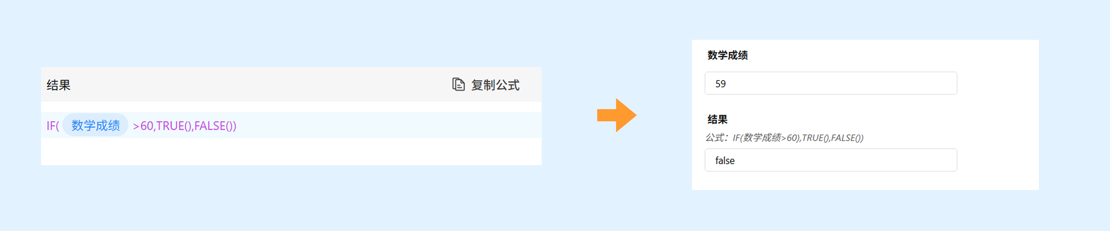 示例:判断数学成绩是否大于60,IF(数学成绩>60,TRUE(),FALSE()),当数学成绩小于60,返回 false。