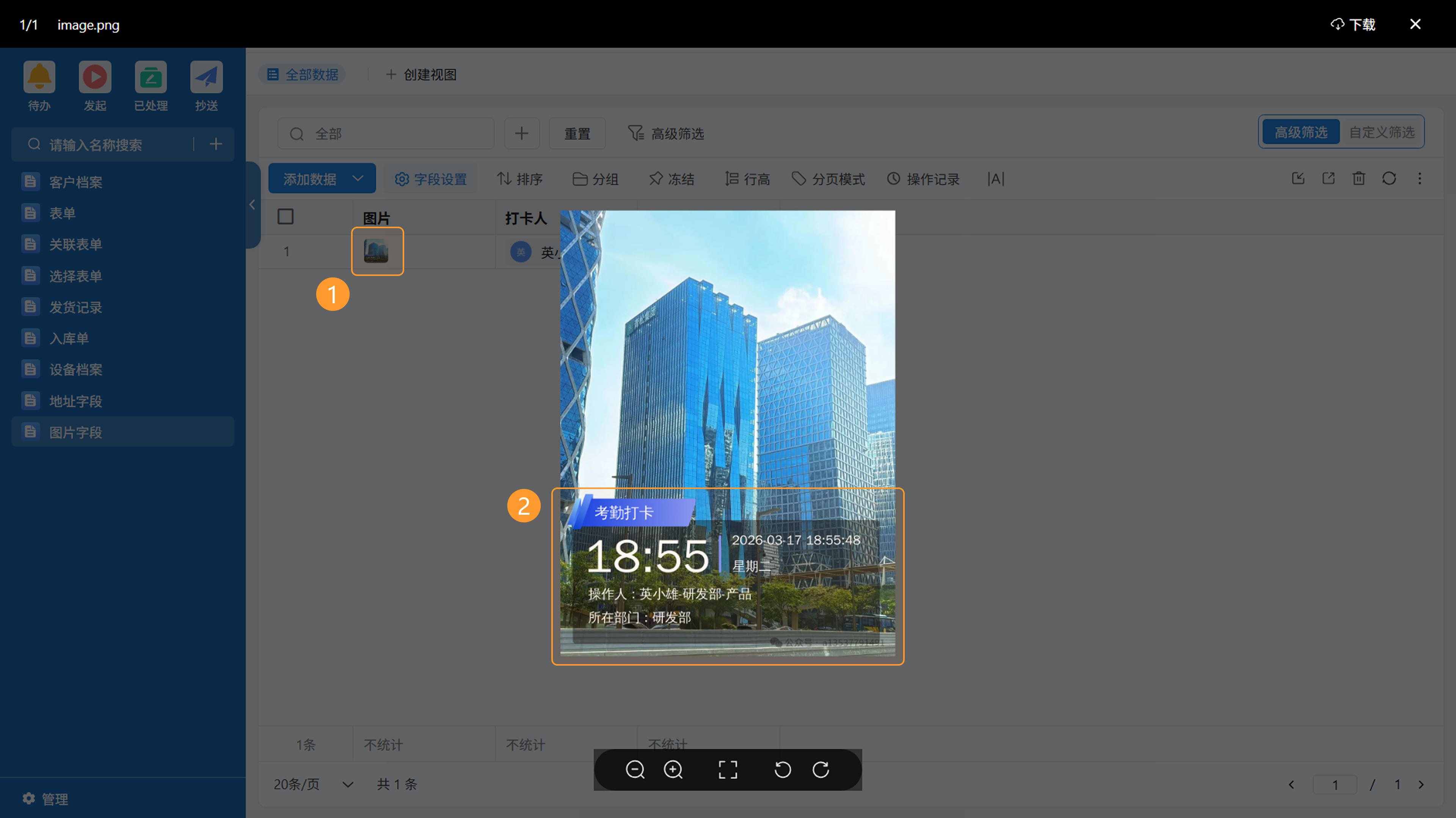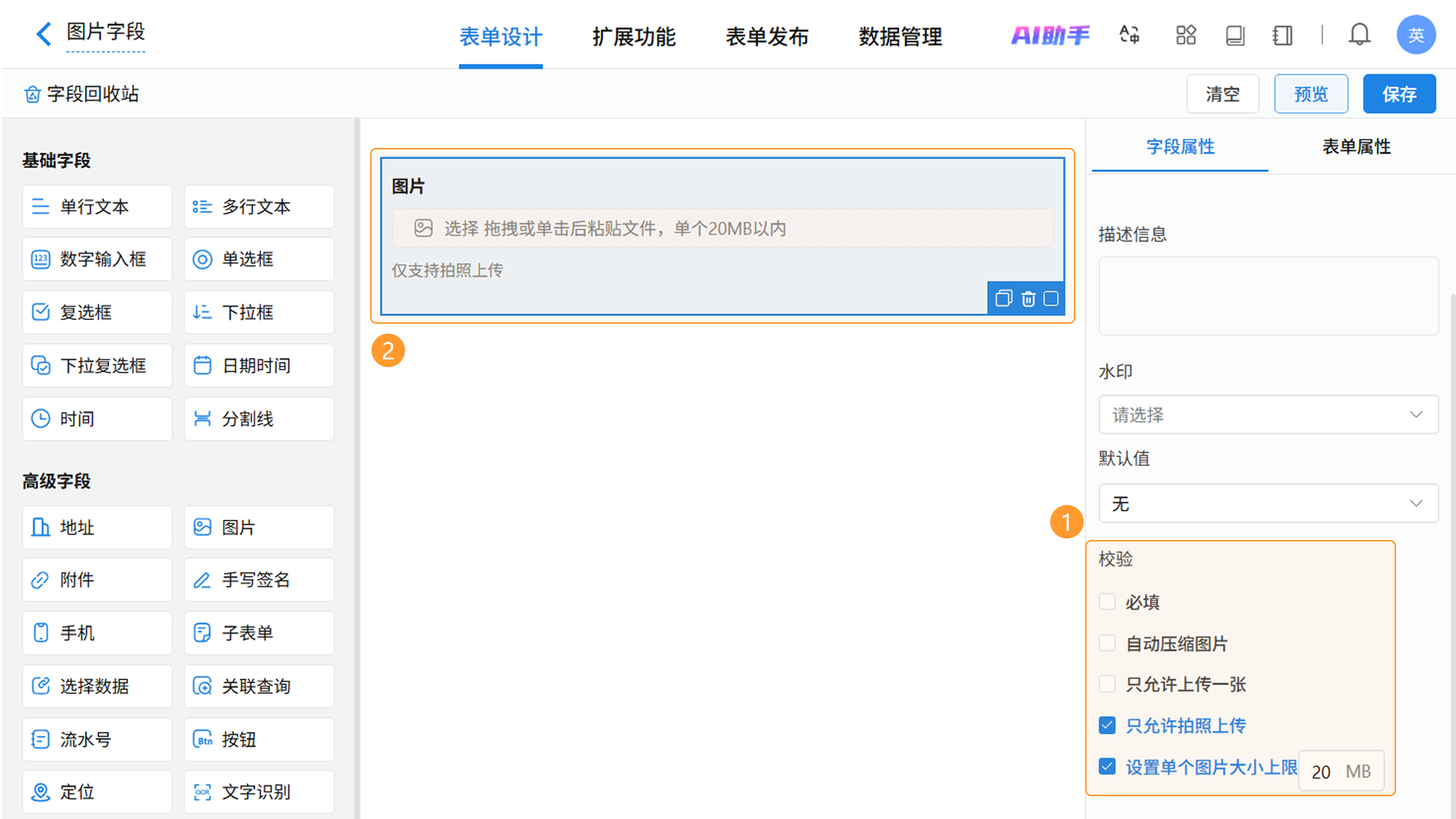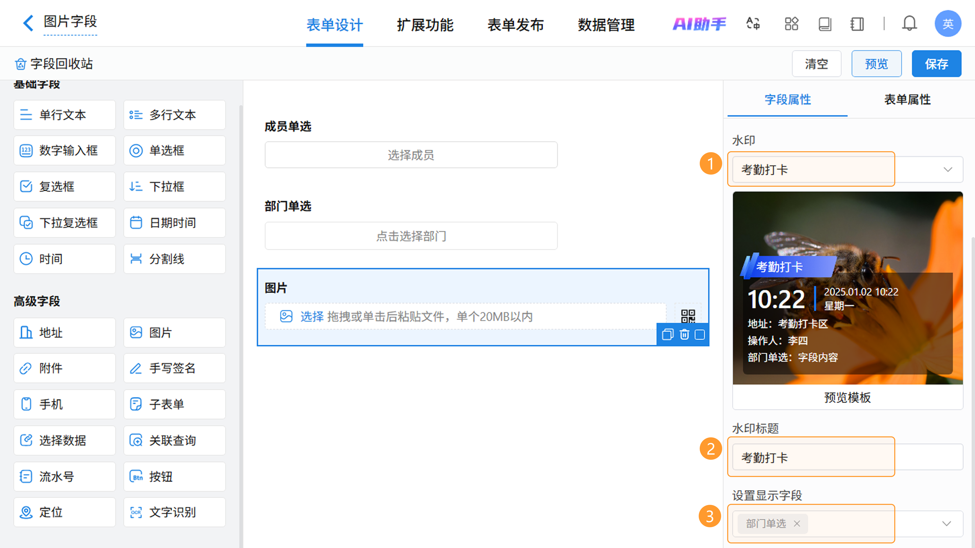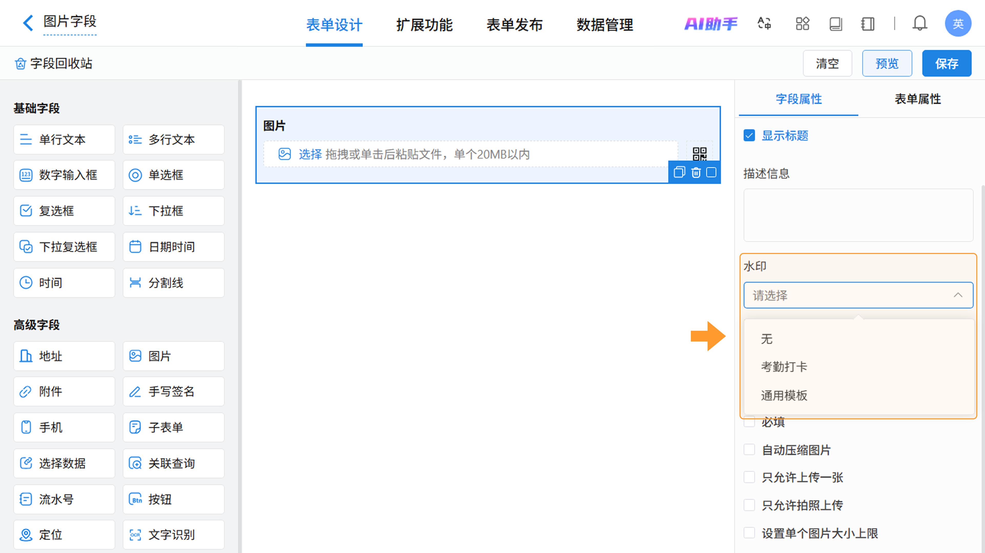 图片字段支持在拍摄或上传后自动添加水印信息。