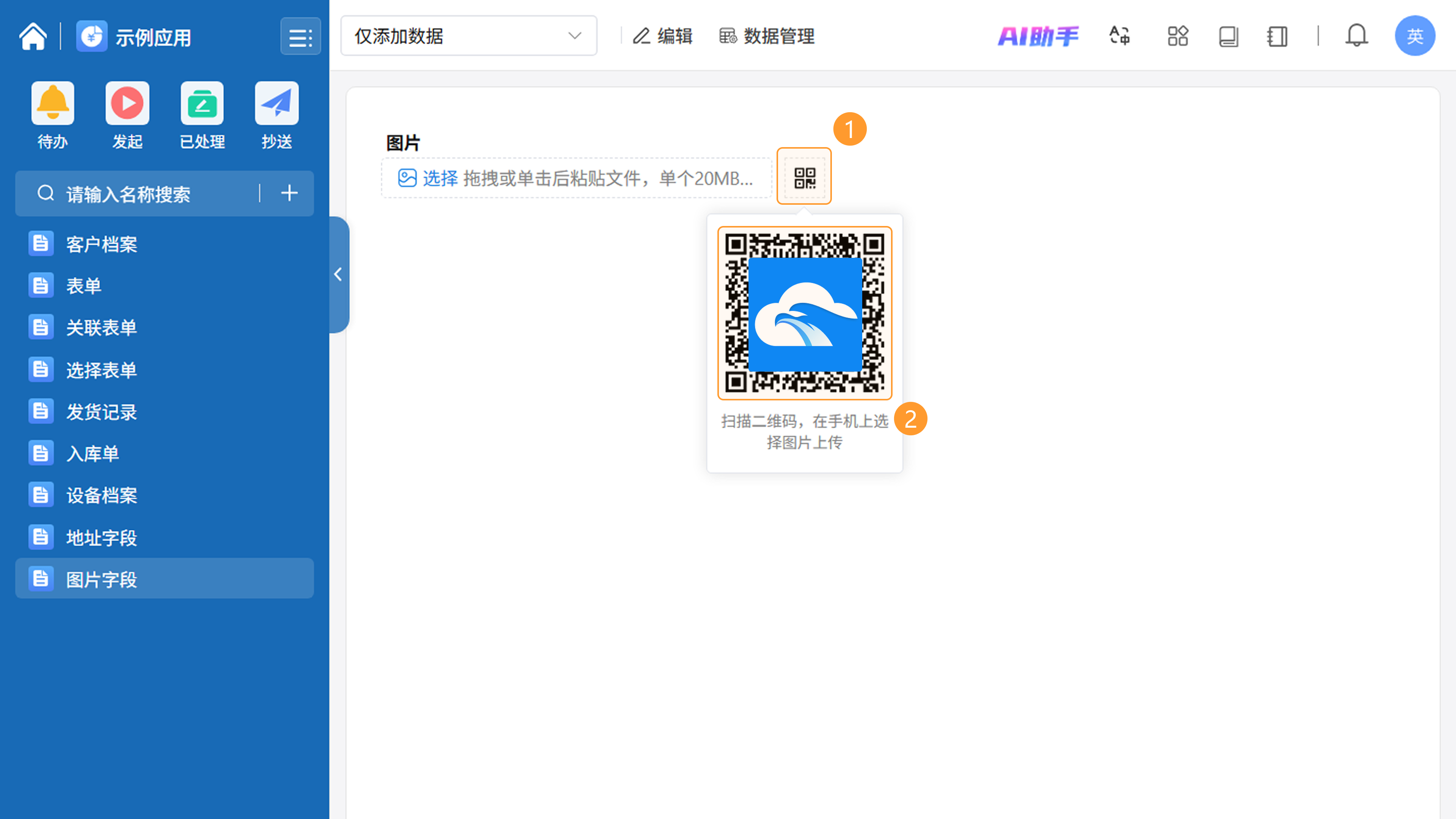 - 手机扫码上传:PC 端点击“扫码上传”图标弹出二维码,手机扫码后可直接拍照或选图同步上传