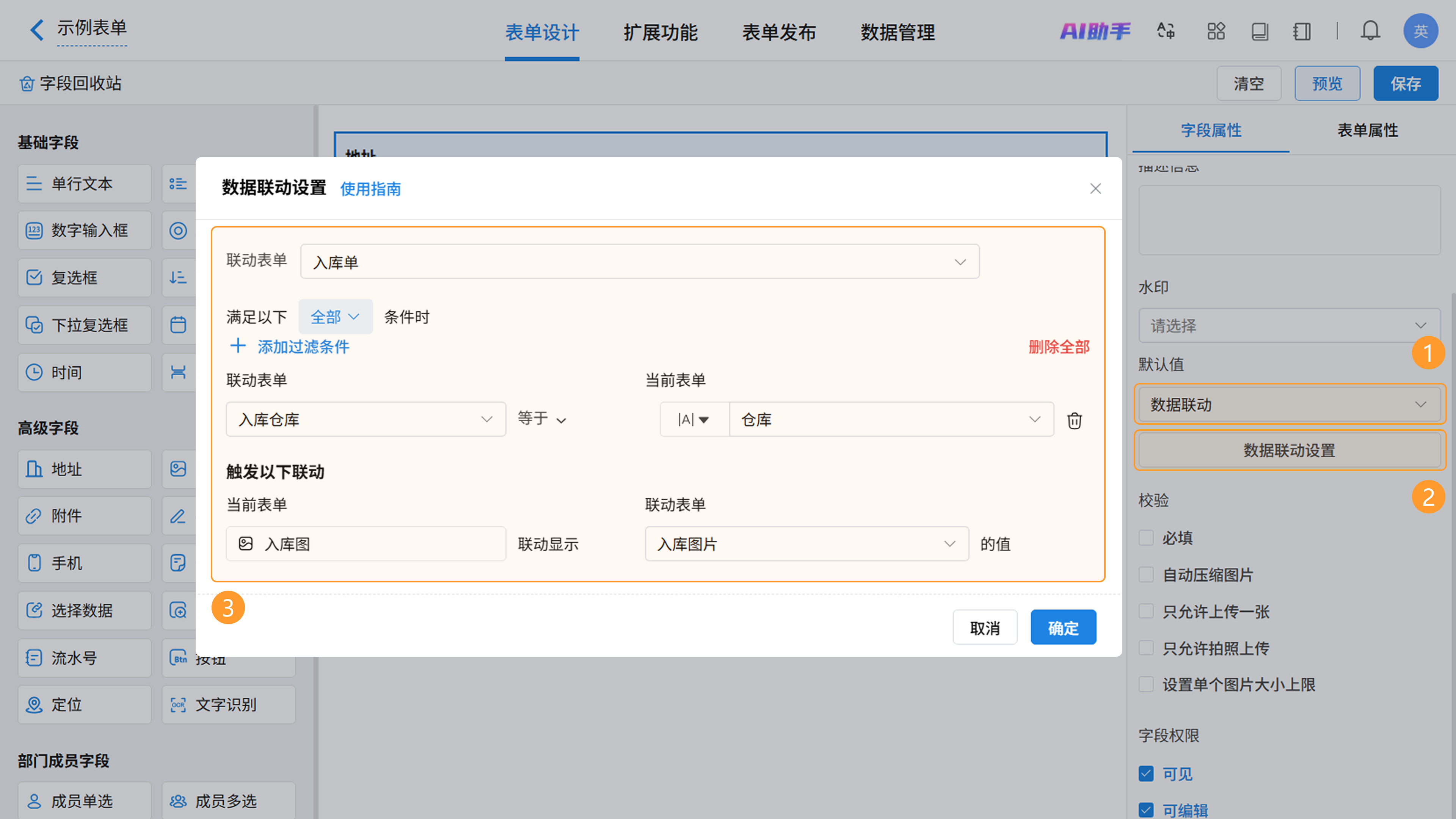 - 数据联动:调取其他表单中满足一定条件的数据作为图片的默认值
