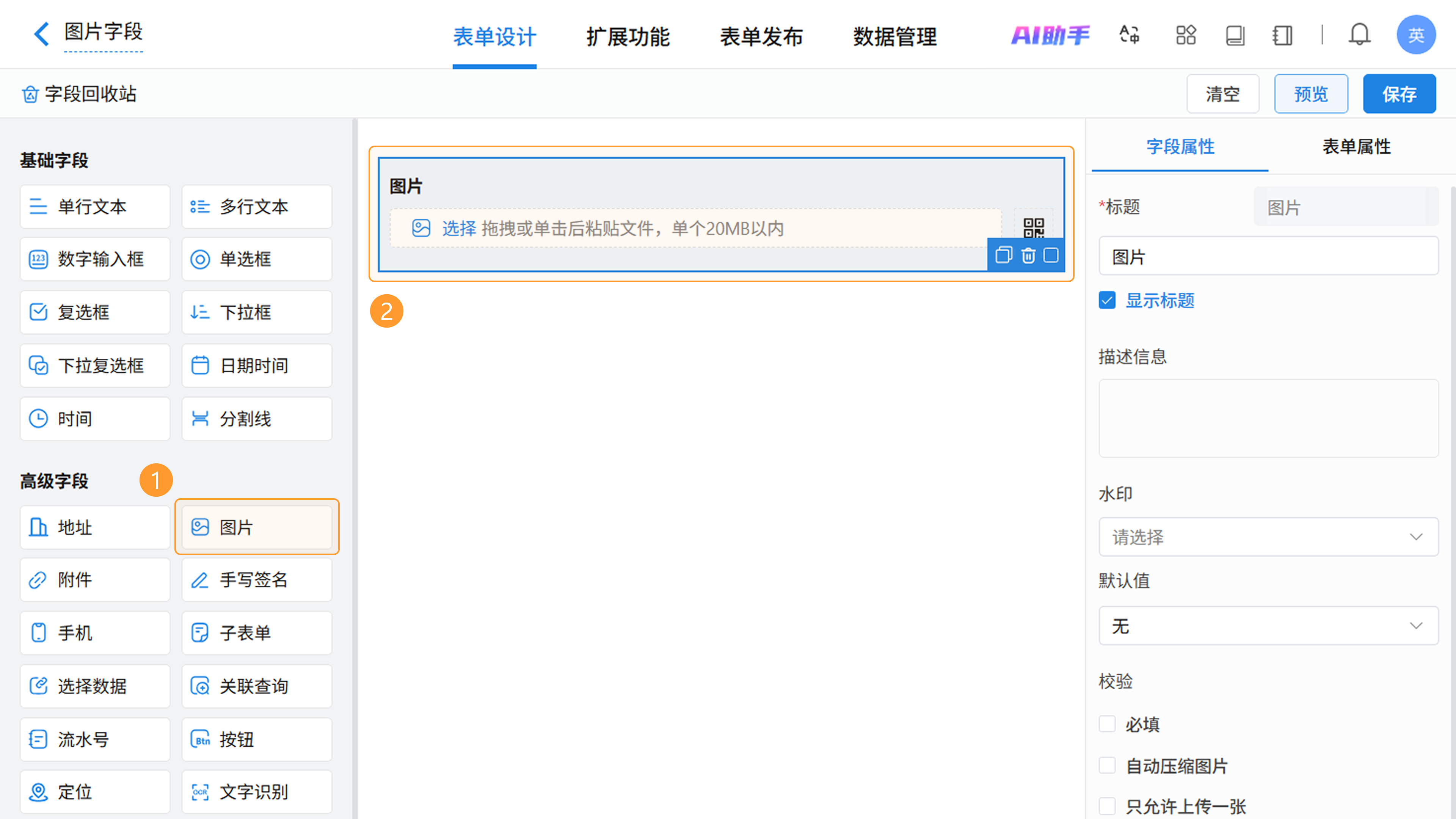 在表单设计页面,从左侧字段区拖拽或点击即可添加图片字段,在右侧属性区进行配置。